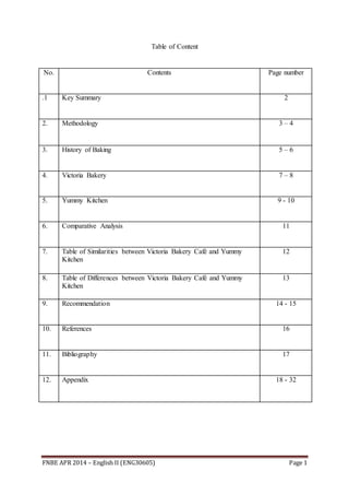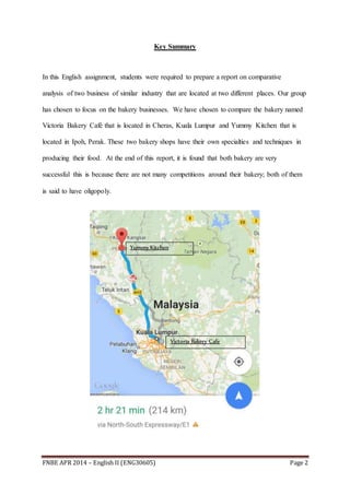 This document provides a report comparing two bakeries - Victoria Bakery Cafe located in Cheras, Kuala Lumpur and Yummy Kitchen located in Ipoh, Perak. It discusses the history and methodology of the research. Details provided on each bakery include their origins, recipes, products, pricing, customer base, and future plans. Both bakeries benefit from a lack of local competition. While Victoria Bakery Cafe has room for improvement in seating and space, Yummy Kitchen could improve customer service and parking availability. The report provides recommendations and conclusions from the comparative analysis.