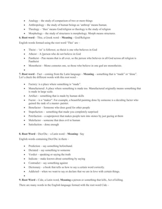This document provides definitions for various English root words derived from Latin and Greek, along with examples of English words that incorporate each root. Some of the root words discussed include "mal" meaning bad, "phobia" meaning fear, "fin" meaning end, "phil" meaning love, "logy" meaning study, and "thei" meaning god. Dozens of other root words and their meanings are listed, along with English words using each root.