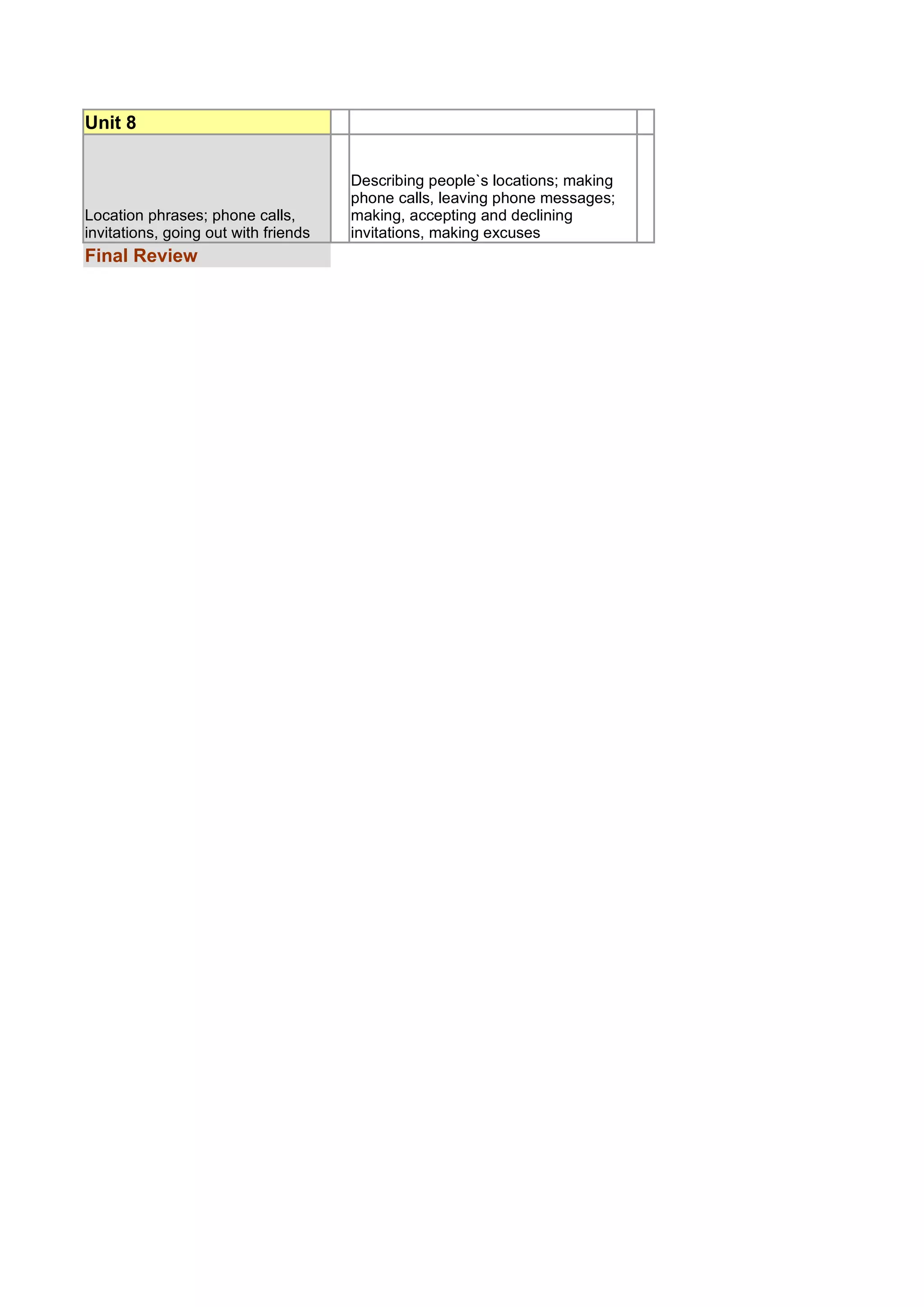 This introductory English course is 30 hours over 8 units and focuses on basic conversational skills. The units cover topics like food, sports, health, shopping, free time activities. Grammar topics include verbs, questions, prepositions. Reading and writing activities involve comprehending and composing questions and short texts on the unit topics. Listening and pronunciation practice includes conversations about the topics, with a focus on stress, intonation, contractions and reductions.