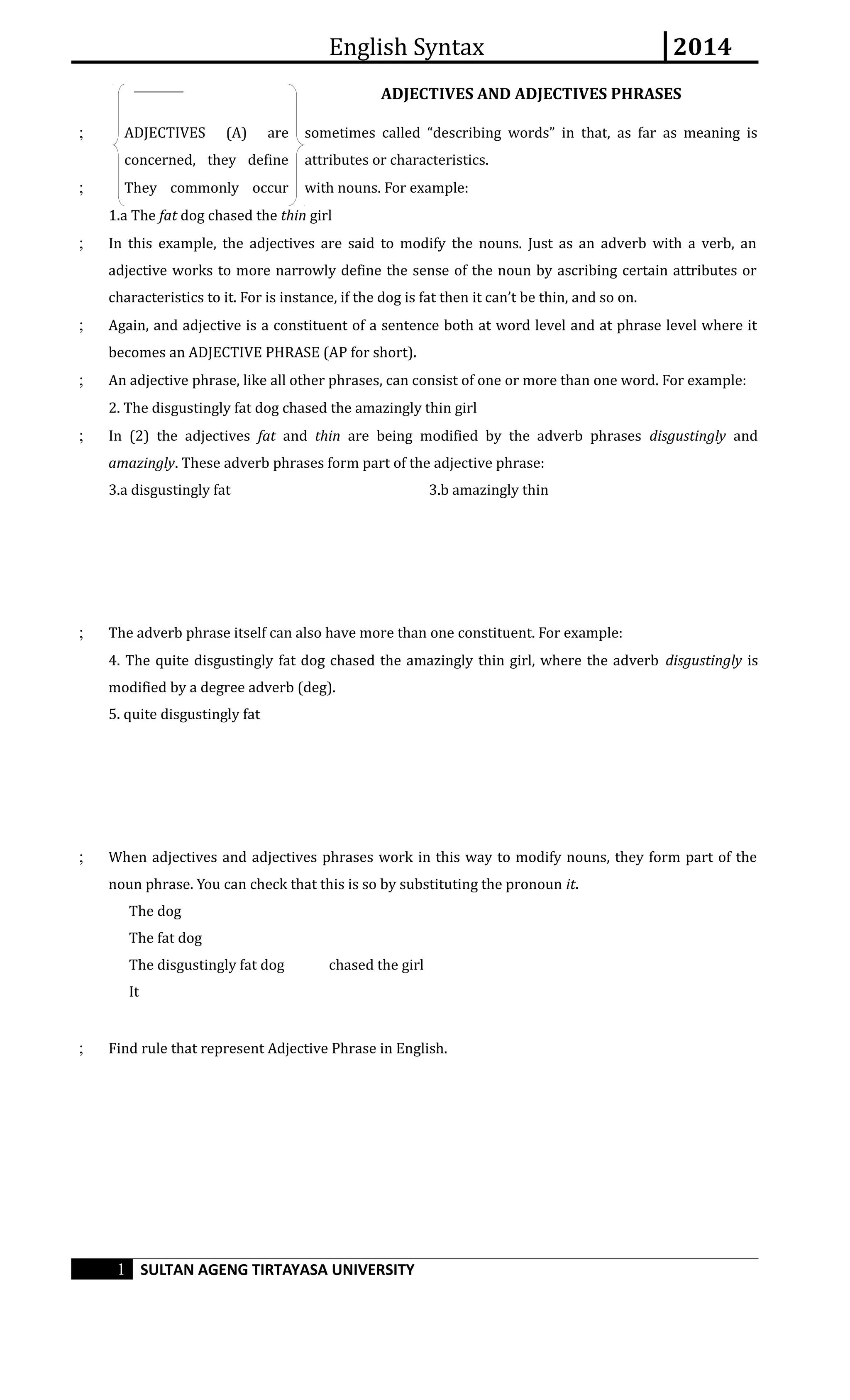 This document discusses different parts of speech and phrases in English syntax, including adjectives and adjective phrases, adverbs and adverb phrases, prepositions and prepositional phrases, and verbs and verb phrases. It provides examples and rules for each type. Adjectives modify nouns, adverb phrases can modify verbs, adjectives, or whole sentences, and prepositional phrases function as part of the predicate. There are different classes of verbs including transitive, intransitive, and ditransitive verbs that take different types of objects.