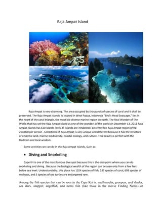 Raja Ampat islands are located in West Papua, Indonesia and are considered one of the most biodiverse marine regions in the world. The islands contain over 600 islands, though only 35 are inhabited, and have an incredibly high number of fish, coral, mollusk, and turtle species. Popular activities in Raja Ampat include diving, snorkeling at sites like Cape Kri to see nudibranchs and reef sharks, birdwatching species like cendrawasih birds, hiking in places like Wayag islands, and buying local crafts. Visitors can also go culinary tourism, and see famous places like Wayag islands, Salawati island where a new rainbowfish species was discovered, Mayal