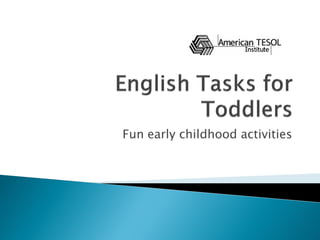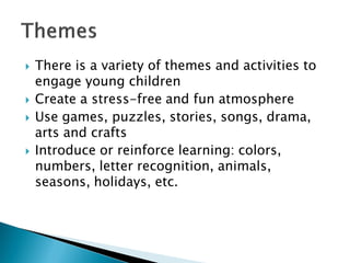 This document provides suggestions for a variety of fun early childhood activities that engage young children's learning. The activities cover different themes like arts and crafts, stories, songs, and drama. They also introduce or reinforce learning concepts like colors, numbers, letters, animals, and seasons. The activities aim to create a stress-free environment and accommodate different learning styles through movement, hands-on projects, books, and more. Specific activity examples include making flowers, playing number games, learning about butterflies, spiders, dinosaurs, shapes, holidays, careers, transportation, weather, and more.