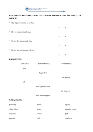 This document contains an English test with multiple choice, fill-in-the-blank, translation and sentence construction questions. It tests skills such as writing negative and interrogative sentences, ordering sentences, translating sentences to English and identifying if they are true or false, completing comparisons, translating vocabulary words, writing true or false sentences, writing sentences about yesterday based on a picture, and circling the correct answers to questions listened to. The test assesses a variety of English grammar and language skills.