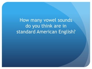 The document discusses the English vowel system. It begins with an English vowel triangle that shows the positions of tongue for different pure vowels. It then provides more details on individual vowels, including their phonetic symbols, example words that contain the vowels, common pronunciation issues, and practice phrases. The document aims to help readers distinguish and produce English vowel sounds correctly.