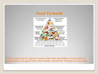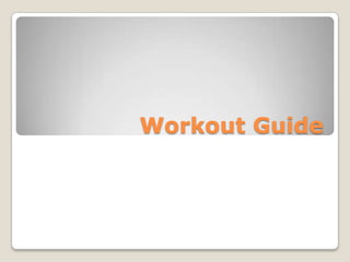 The document provides tips and recommendations for working out, including using a food pyramid as a guide for nutrition, proper weight lifting techniques to avoid injury, meal replacements to supplement protein intake, inexpensive weight bands as an alternative to weights, appropriate workout clothing and shoes, keeping a workout journal, staying hydrated, importance of rest and sleep, benefits of a workout partner or buddy, using music for motivation, and how a gym membership can provide resources and routine.