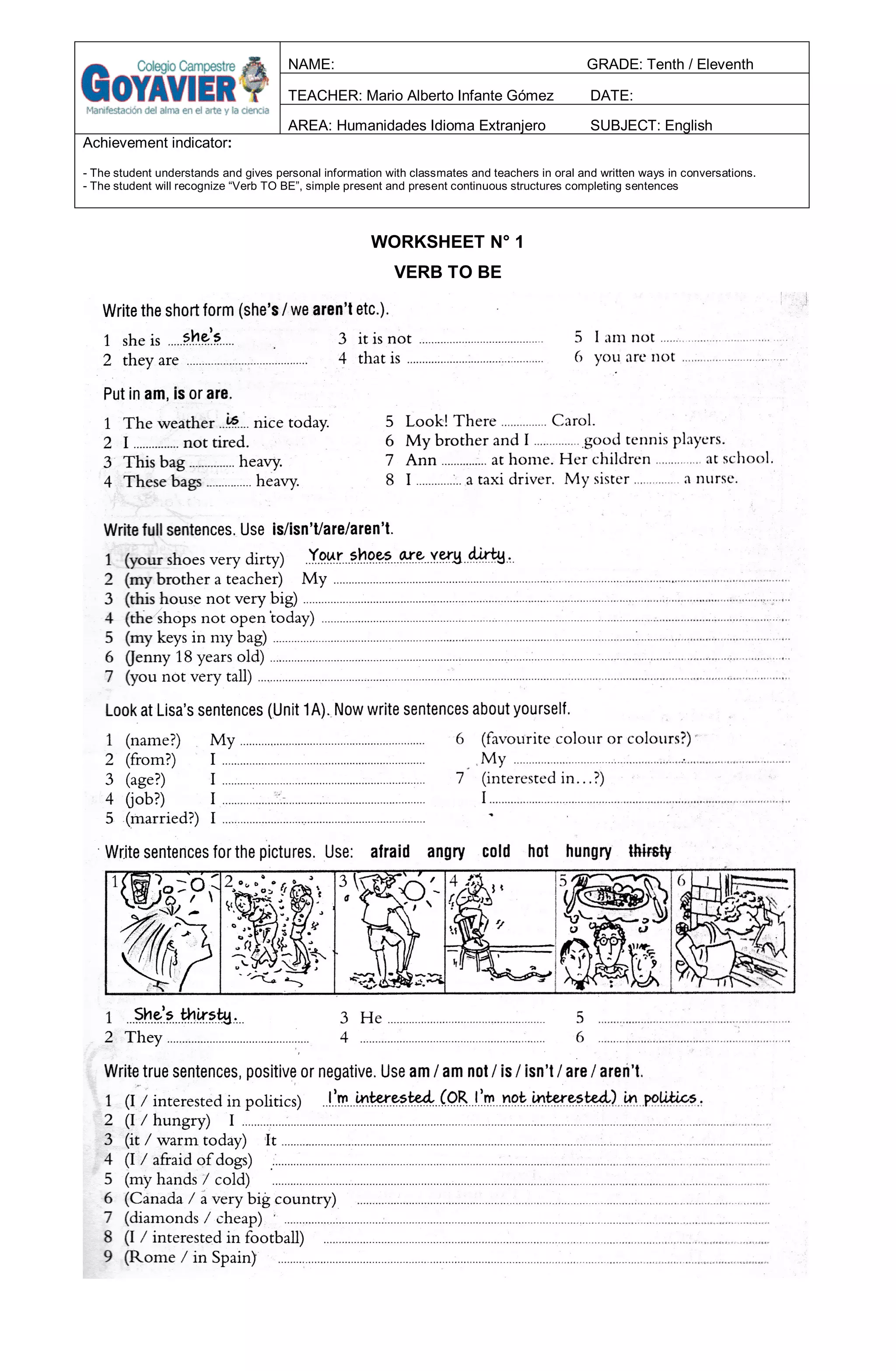 The student understands and gives personal information with classmates and teachers in oral and written ways in conversations. The student will recognize “Verb TO BE”, simple present and present continuous structures completing sentences in a worksheet about verb tenses including present continuous and simple present. The worksheet contains 12 sentences for the student to complete using verb to be structures.