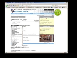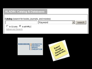 This document provides information and resources for students conducting research, including an overview of the research process from topic selection to drafting and revising. It also lists the libraries that participate in the Consortium of Universities of the Washington Research Library Consortium (WRLC) and provides contact information for a librarian, Kimberly Hoffman, and her assistant, Michelle Bolger, for students needing research help or having questions.