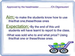 The document outlines an English lesson plan about shopping. The lesson aims to teach students how to use this/that and these/those when referring to objects. The plan includes warm-up activities, an exercise matching items to stores, practicing store names, and a grammar lesson on one/ones and this/that/these/those. Students will then complete sentences using the new vocabulary and review by answering questions about purchases made in the story dialogue. For homework, students finish the dialogue using words from a provided list.