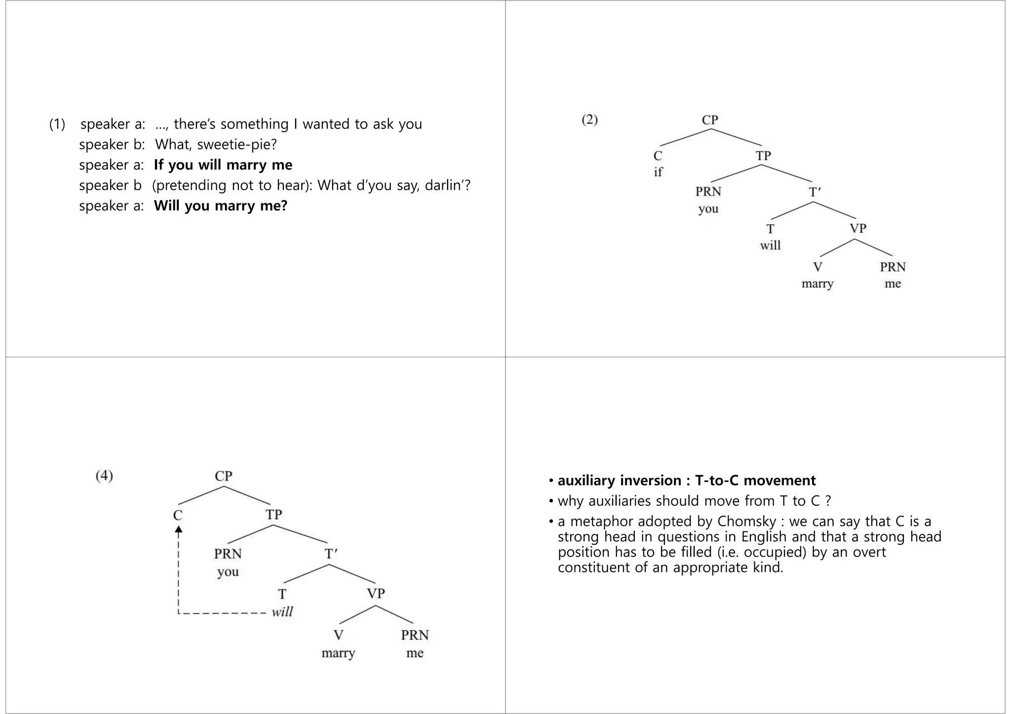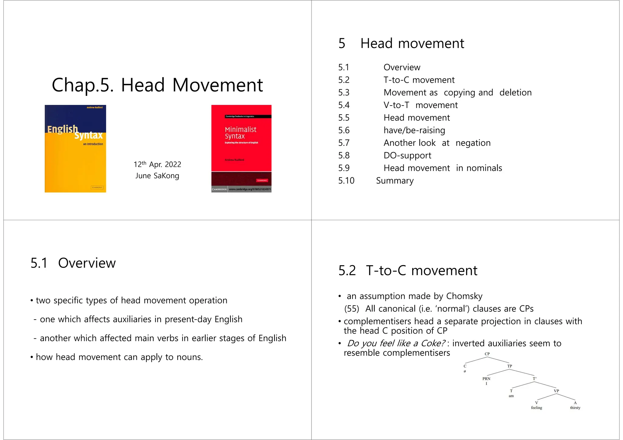 This document discusses head movement in syntax. It covers two types of head movement: T-to-C movement which affects auxiliaries in modern English, and V-to-T movement which occurred in earlier English. It examines examples of these movements and proposes mechanisms like copying and deletion. Other topics covered include have/be-raising, negation, and DO-support. Principles governing head movement like the Head Movement Constraint are also outlined.