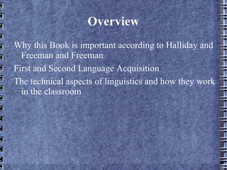 This document provides an overview and summary of key topics from the book "Essential Linguistics" by David Freeman and Yvonne Freeman. It discusses why linguistic knowledge is important for teachers, concepts like what it means to know a word, theories of first and second language acquisition, phonology and teaching phonemic awareness, and the history and issues with teaching phonics. It also notes resources used in the book.