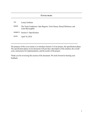 This cover memo introduces Section 5 of a project document, which will provide a description of the solution to the project, the overall costs, instructions for implementation, and expected results. The memo is from four train conductors to Lonny Grafman and seeks feedback on the specification phase section.