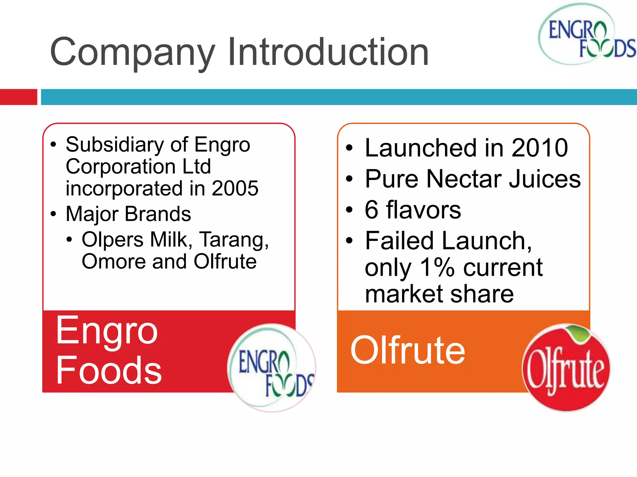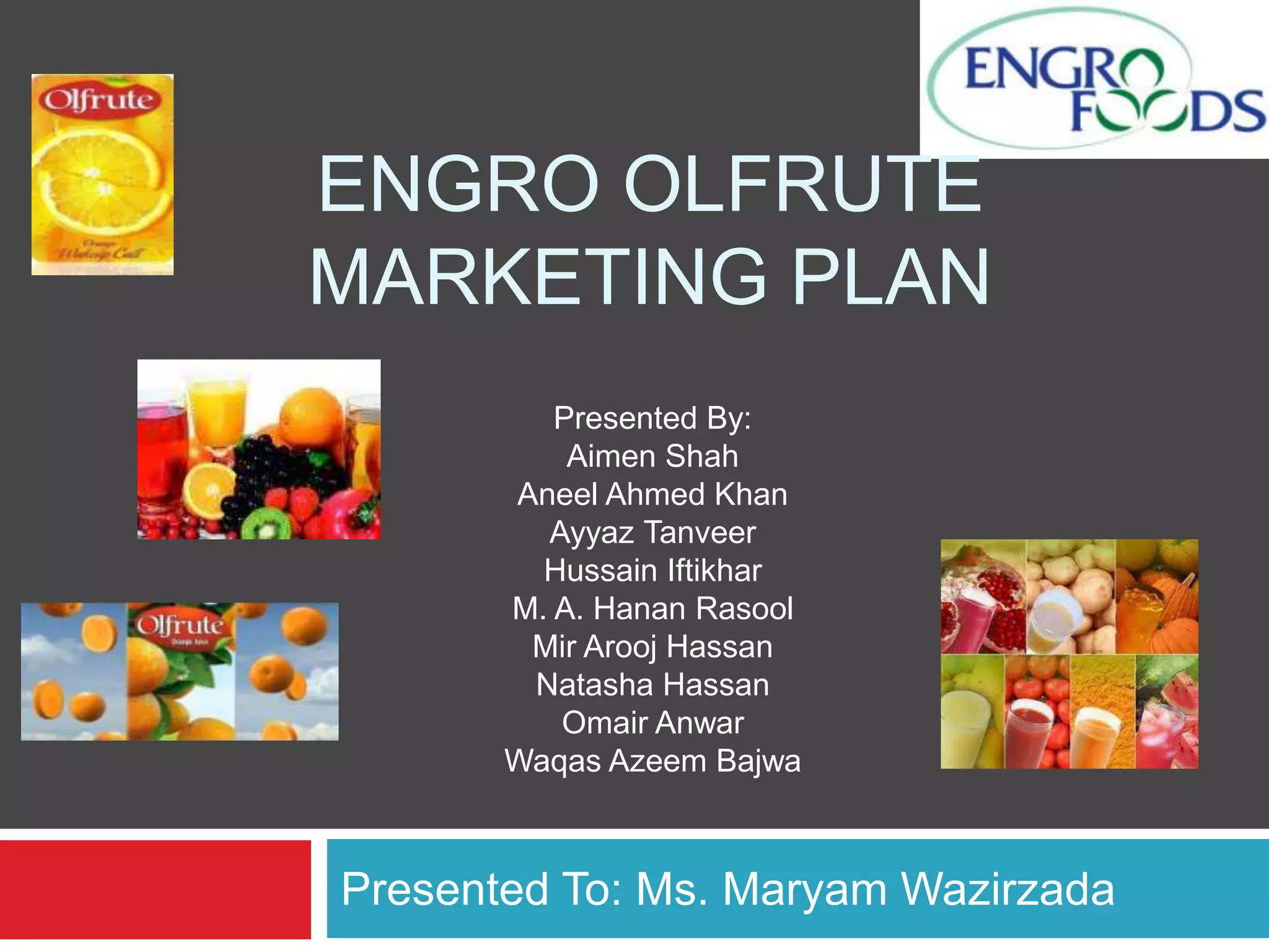 The document outlines Engro Foods' marketing plan for its Olfrute juice brand, launched in 2010 but currently holding only 1% market share. It details competitor analysis, SWOT assessment, and marketing objectives, including targeting health-conscious youth and achieving a 15% market share in the first year. The plan includes product differentiation, pricing strategies, extensive promotional activities, and a robust distribution network leveraging Engro's established channels.