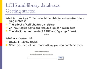 2. It discusses how to search the library catalog (LOIS) and databases to find books, articles, and other materials. Keyword and subject searching in LOIS are covered.