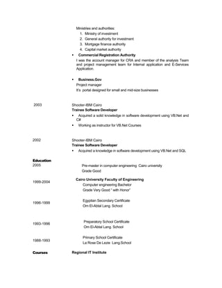 Engy Youssef A.Sattar is seeking a position as a project manager or sales manager. She has over 10 years of experience in sales, project management, and software development. Most recently, she worked as the sales and project manager for the governmental sector at Wireless Dynamics, where she succeeded in securing deals with several major Egyptian companies and authorities. Prior to that, she held roles in investment services, project management, and software development at the Ministry of State for Administrative Development, IBM Egypt, and other organizations. She has a Bachelor's degree in Computer Engineering from Cairo University and several technical certifications.