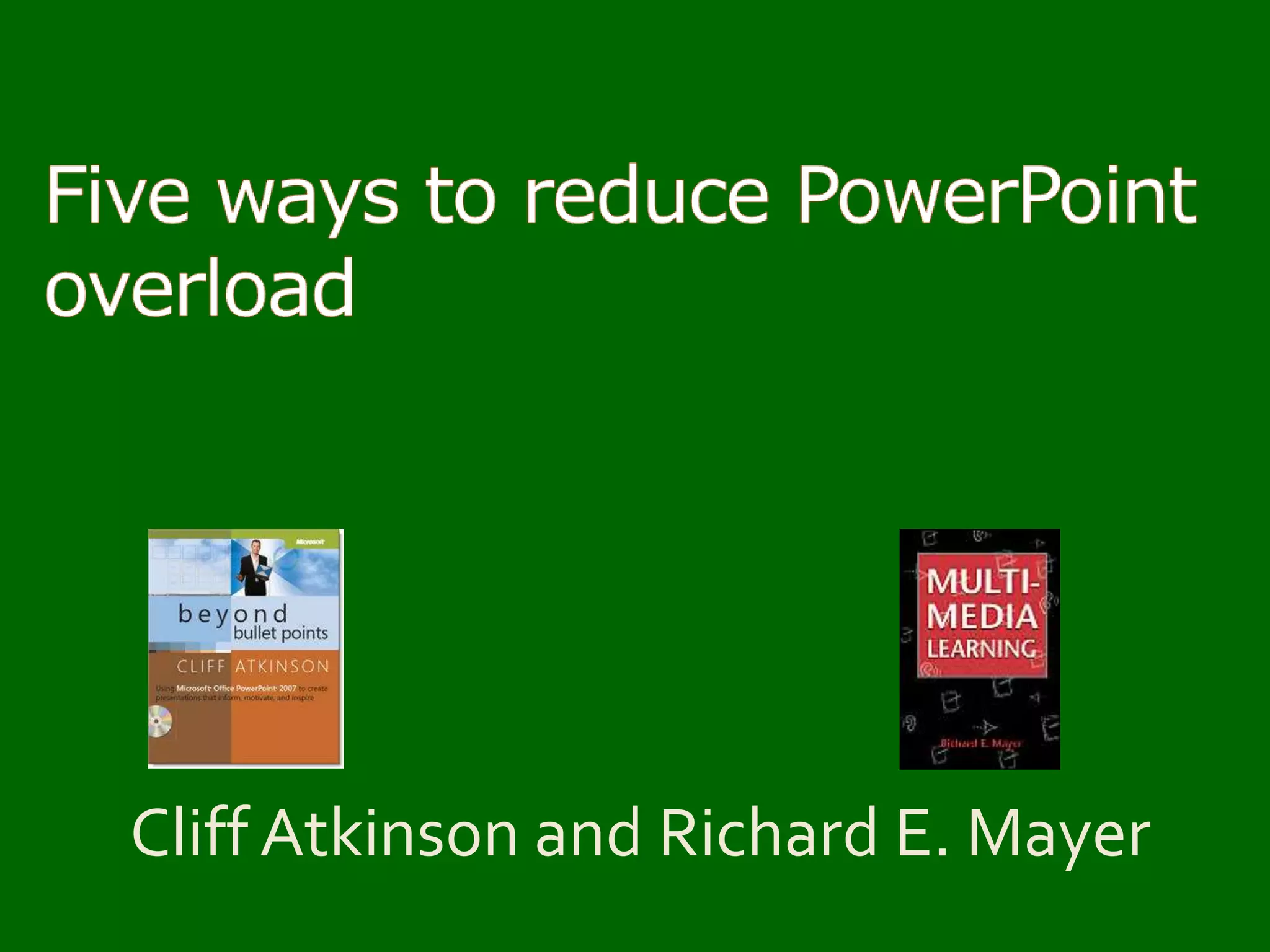 The document discusses how PowerPoint presentations can overload students and hinder learning if not used properly. It recommends asking how students learn best rather than how to use multimedia. People can only focus on a few bits of information at a time. There are three types of memory and no research supporting today's common uses of PowerPoint. The document provides five tips to reduce PowerPoint overload, such as breaking content into digestible sections and removing unnecessary elements.