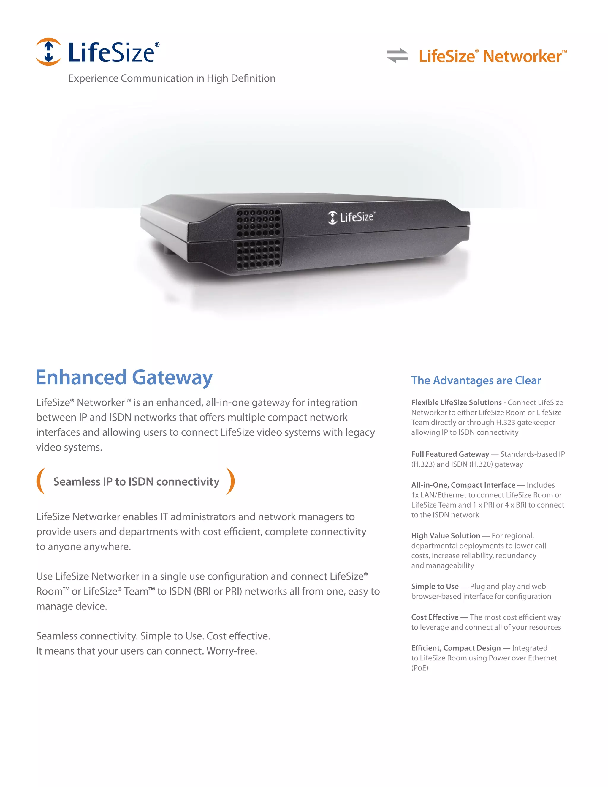 LifeSize Networker is an all-in-one gateway that provides seamless connectivity between IP and ISDN networks. It allows LifeSize video systems to connect to legacy ISDN systems through H.323 and H.320 standards. The Networker provides flexible connectivity through a single compact device with integrated network interfaces. It offers a cost-effective solution for regional deployments to lower call costs and increase reliability.