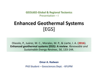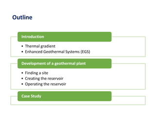 1) The document discusses enhanced geothermal systems (EGS), which artificially create underground reservoirs in hot rock with low permeability by hydraulically fracturing the rock and circulating water to extract geothermal energy.
