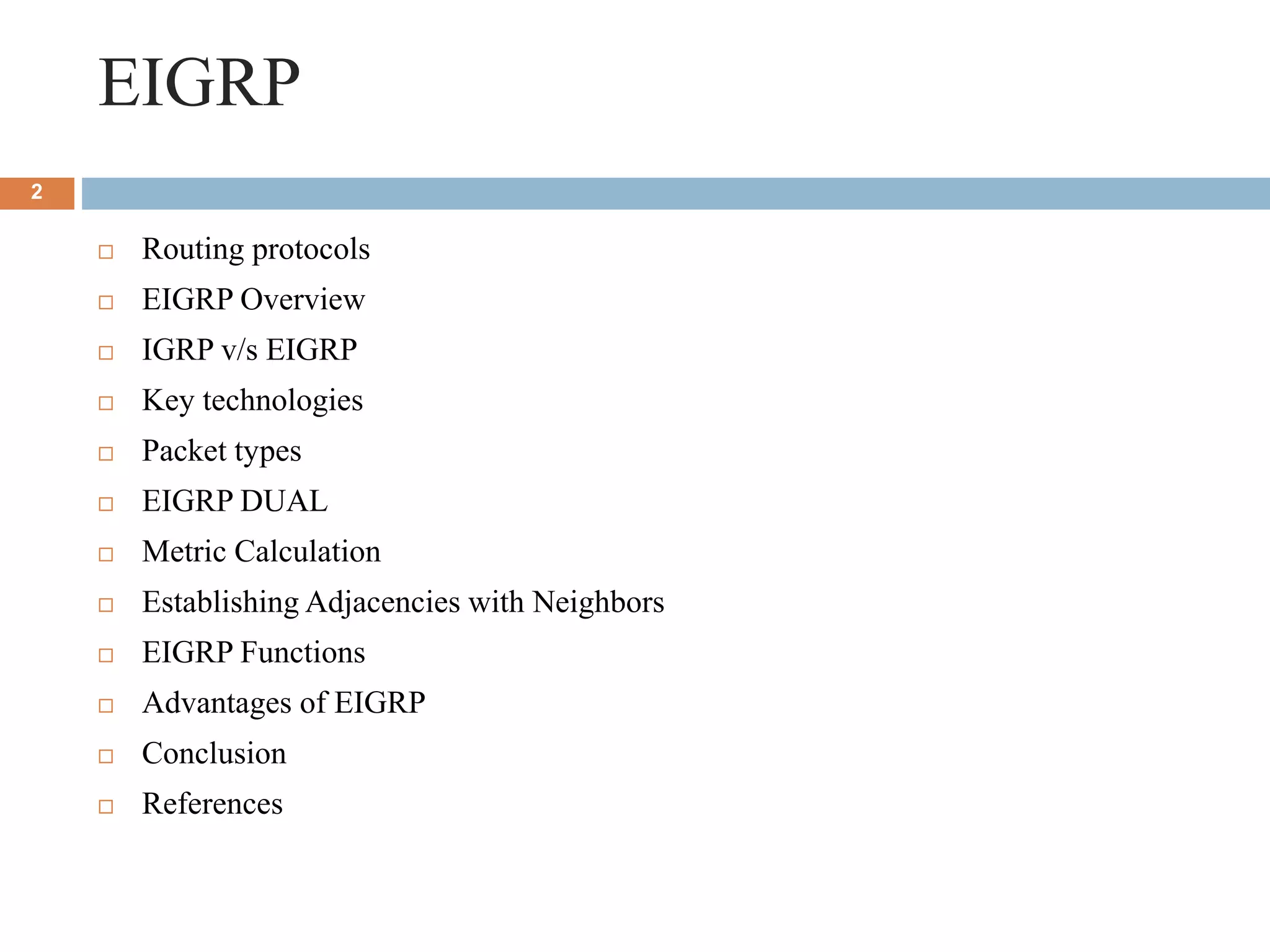 This presentation by Nutan Singh discusses Enhanced Interior Gateway Routing Protocol (EIGRP), detailing its features, functionalities, and comparisons with IGRP. EIGRP is an advanced, classless, hybrid routing protocol that utilizes a Diffusing Update Algorithm (DUAL) for route calculation and supports multiple protocols. Key advantages include rapid convergence, efficient bandwidth usage, and the ability to support unequal-cost load balancing.