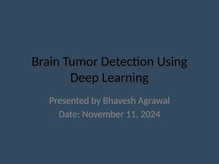 The document provides an overview of brain tumor detection using deep learning, highlighting the challenges and importance of early diagnosis. It discusses the role of convolutional neural networks (CNNs) and advanced techniques like vision transformers for improving detection accuracy. Additionally, it outlines a case study on VGG architecture and future directions, emphasizing the potential for real-time diagnostics and personalized treatment in medical AI.