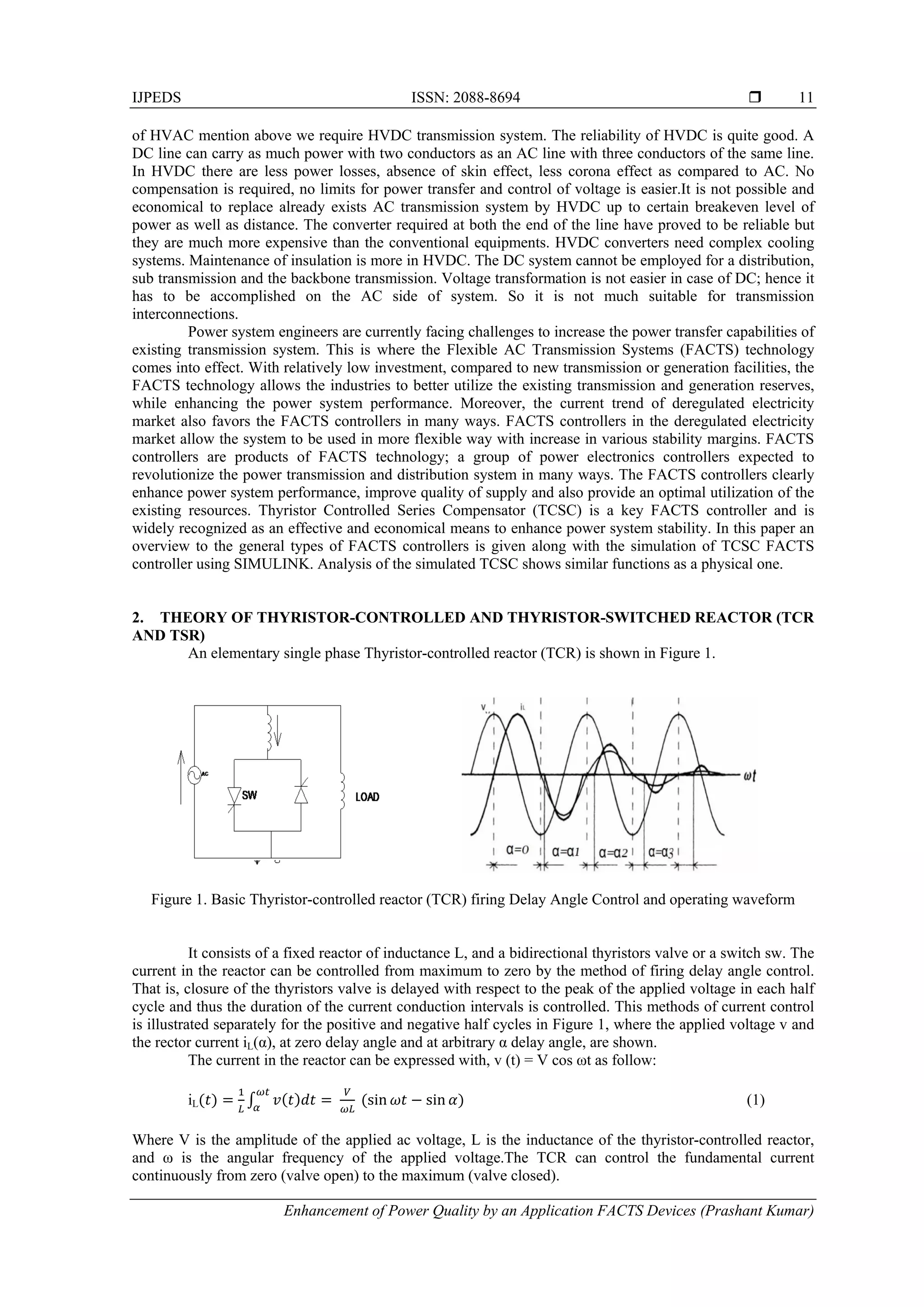 1) The document discusses the use of Flexible AC Transmission Systems (FACTS) devices like Thyristor Controlled Series Capacitor (TCSC) and Thyristor Controlled Reactor (TCR)-based Static VAR Compensator (SVC) to enhance power quality and transmission capability.