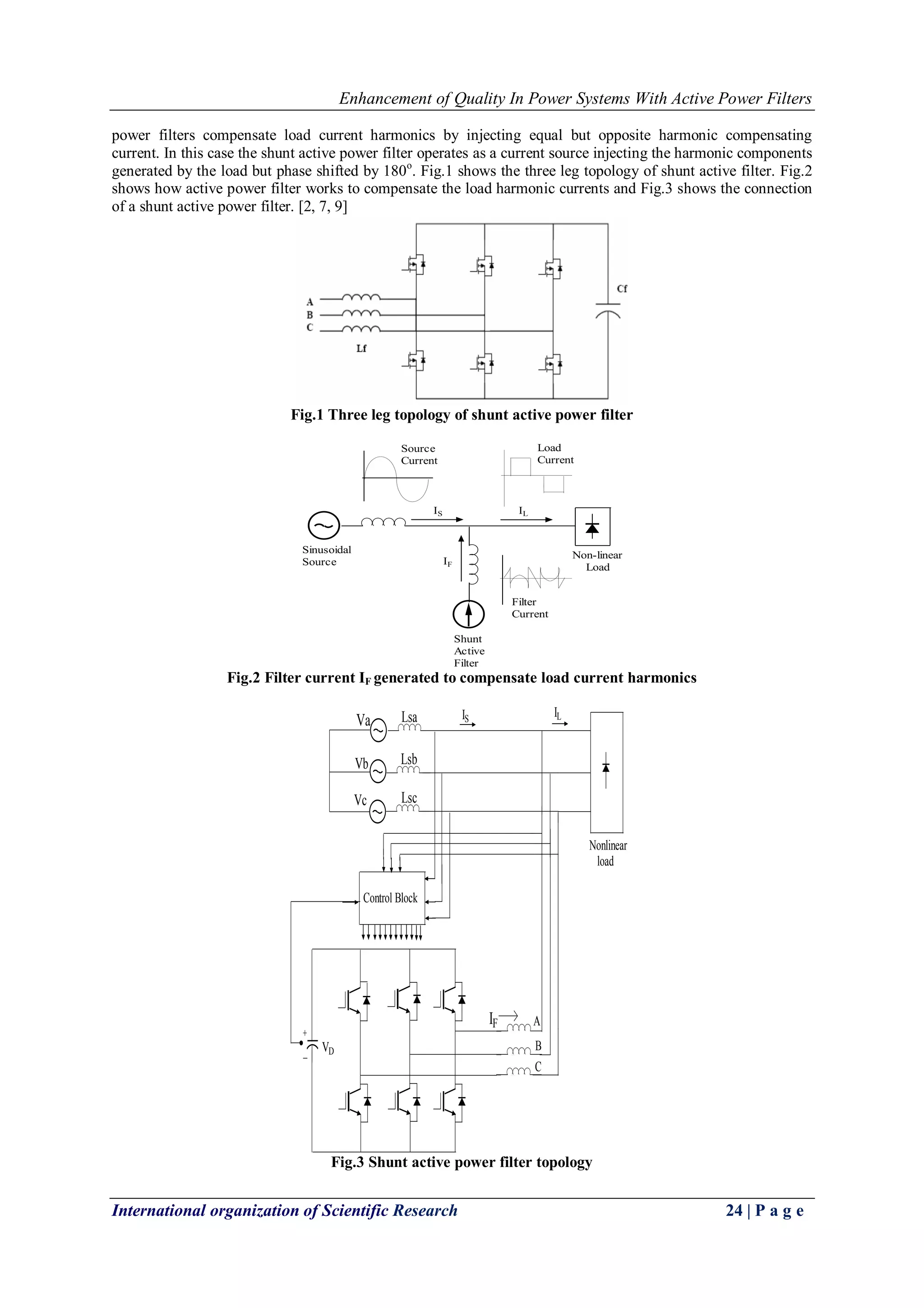 The document describes the use of active power filters to improve power quality by compensating for harmonics and reactive power required by nonlinear loads. It discusses shunt active power filters, which compensate for harmonic currents, and series active power filters, which compensate for voltage harmonics. The key points are: