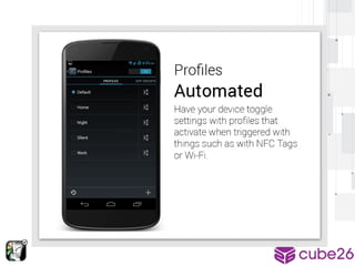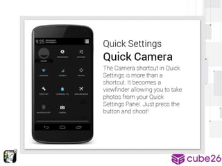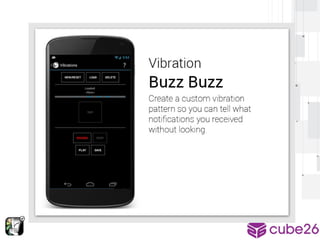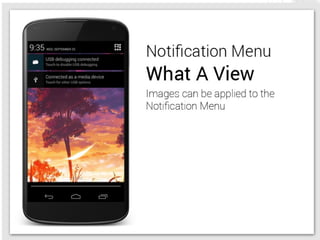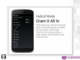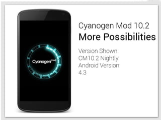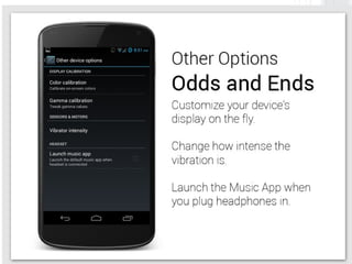 This document provides an overview of modifying and enhancing the Android OS. It describes the structure of the Android OS including applications, frameworks, Dalvik/ART runtime, libraries, and kernel. It also discusses how to build Android for a phone, what parts can be modified, and how to contribute changes back to the Android Open Source Project. The document is presented by Arnav Gupta, an undergraduate student and Android Framework Engineer at Cube26, an Indian startup focused on gesture-based features for Android.