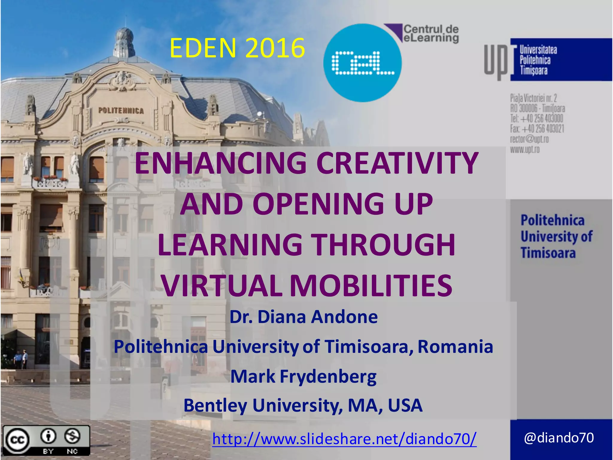 The document discusses a project by Dr. Diana Andone and Mark Frydenberg that engaged students in virtual mobilities to enhance creativity and digital literacy across different countries. It outlines the use of various technology and communication tools for collaborative multimedia research, while assessing student attitudes toward these tools and their effectiveness in fostering creativity. The findings highlight the importance of digital skills for students, emphasizing lifelong learning and the ability to adapt to new technologies in a global environment.