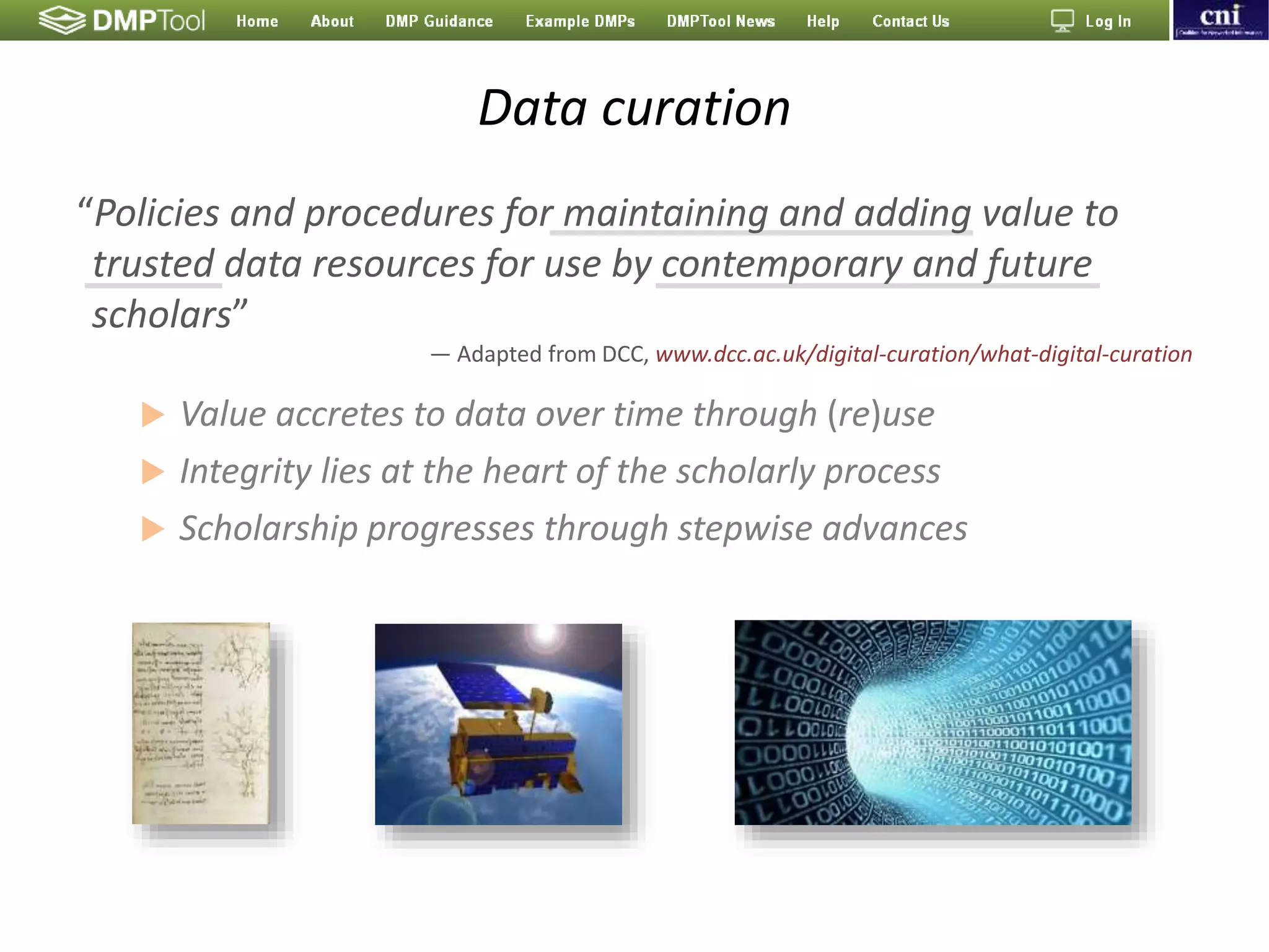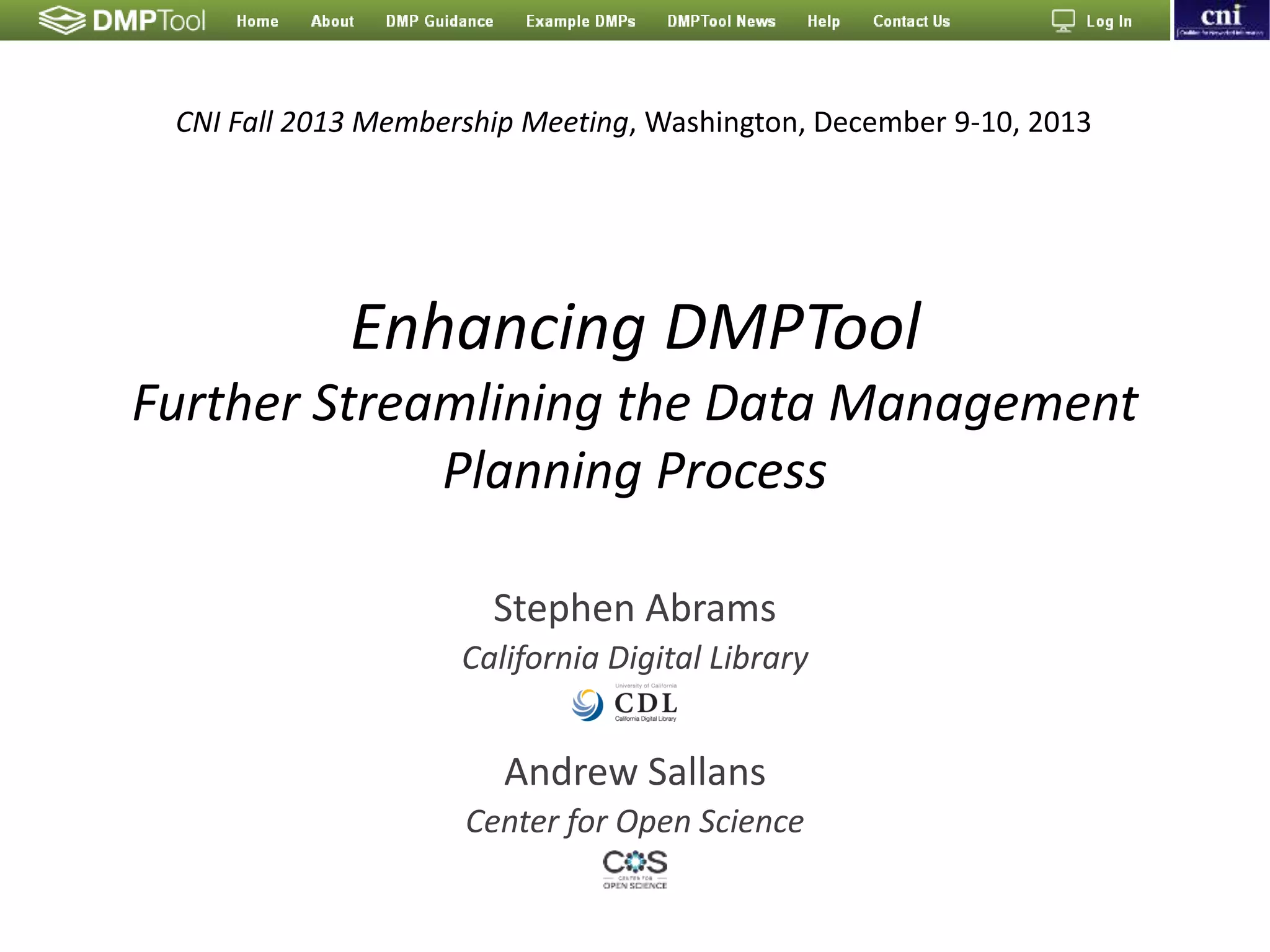 The document discusses enhancements to the DMPTool to further streamline the data management planning process. DMPTool2 will add new features like co-ownership of plans, self-service administration, and optional plan review. It will have improved governance and be jointly developed by additional partners. The goal is to better support the creation of data management plans, which are increasingly required for funding and publication.