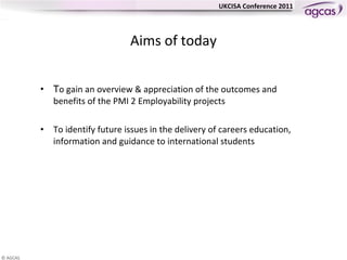 The document summarizes various projects funded by the UK's Prime Minister's Initiative to enhance the employability of international students. It discusses projects conducted by organizations like AGCAS, NASES, HECSU that included developing online resources, conducting employer events, building international alumni networks, and creating databases to connect students and employers globally. It highlights lessons learned around meeting student and employer expectations as well as future challenges in sustaining projects and skills development.