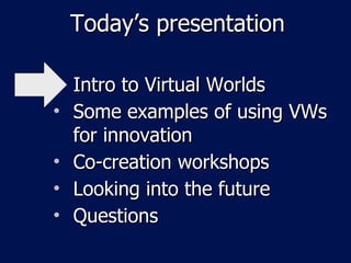 The document discusses the emergence of virtual worlds (VWs) as tools for innovation and co-creation, highlighting their applications in corporate training, product development, and user collaboration. It outlines the impact of technology on consumer engagement, the role of avatars in participation, and provides examples of successful initiatives in virtual environments. The document concludes with a call to explore the potential of VWs for revolutionizing various industries and fostering entrepreneurial opportunities.