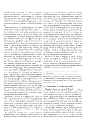 This document proposes PAIDS, a Proximity-Assisted Intrusion Detection System that identifies unknown worm outbreaks by leveraging proximity information of compromised hosts. PAIDS operates independently from existing signature-based and anomaly-based IDS approaches. It observes that compromised hosts tend to cluster geographically and remain active for long periods, allowing proximity to infected machines to indicate higher infection risk. The document motivates PAIDS based on limitations of other IDSes and clustered/long-term nature of worm spread. It then outlines PAIDS design, deployment model, software architecture, and key components for detecting outbreaks using proximity information.