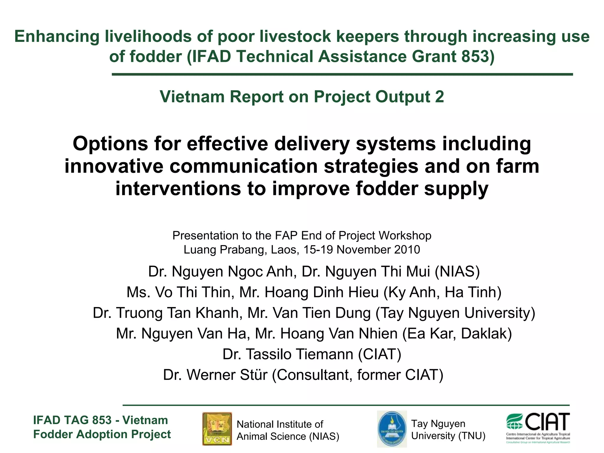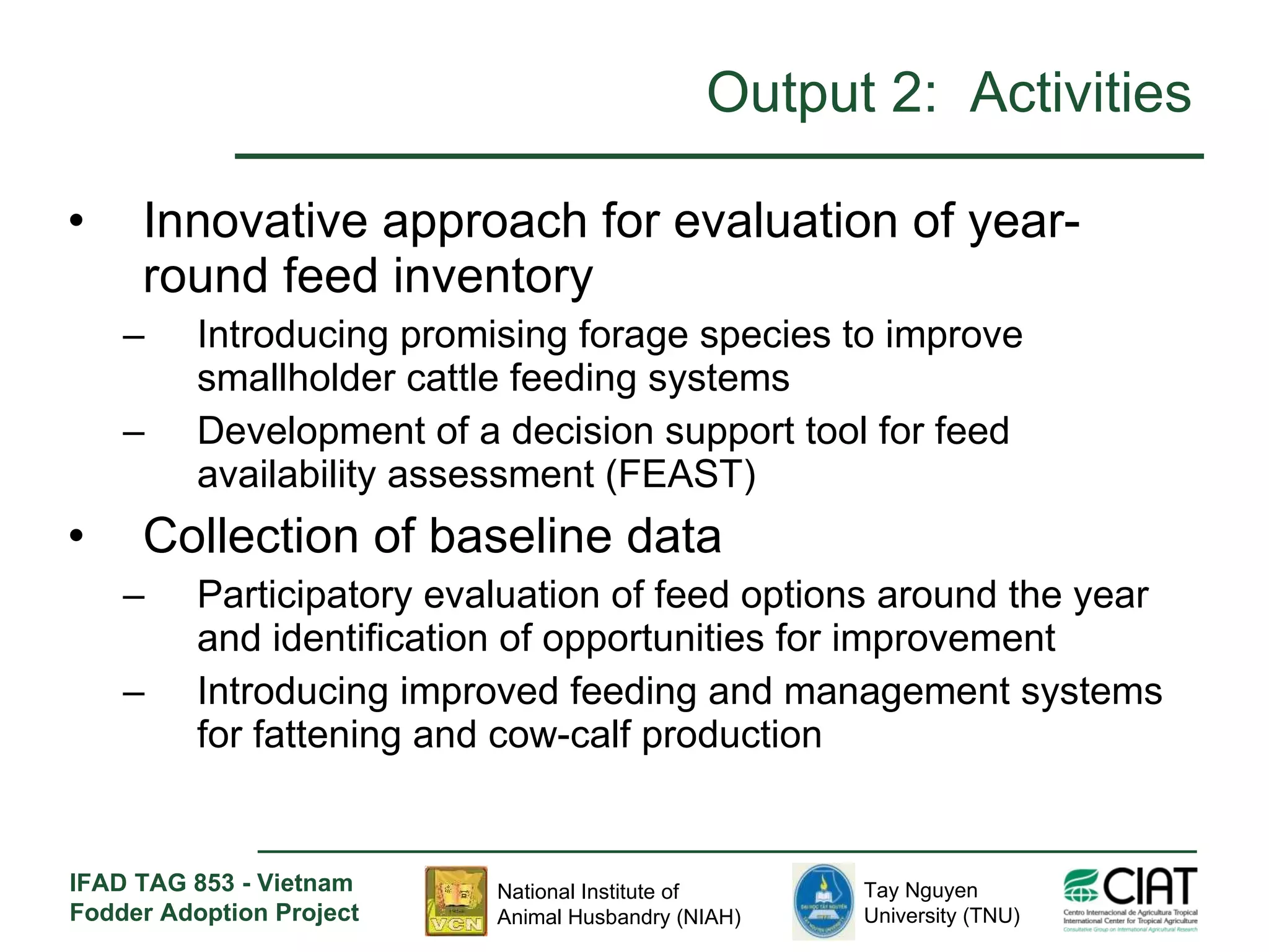 The document outlines strategies for improving fodder supply and livestock management in Vietnam, aimed at enhancing the livelihoods of smallholder cattle farmers. Key activities include introducing promising forage species, developing decision support tools, participatory evaluations of feed options, and refining feeding systems with stakeholder feedback. The project has engaged over 1,000 farmers and established self-managed clubs to share knowledge and technologies for better cattle production.