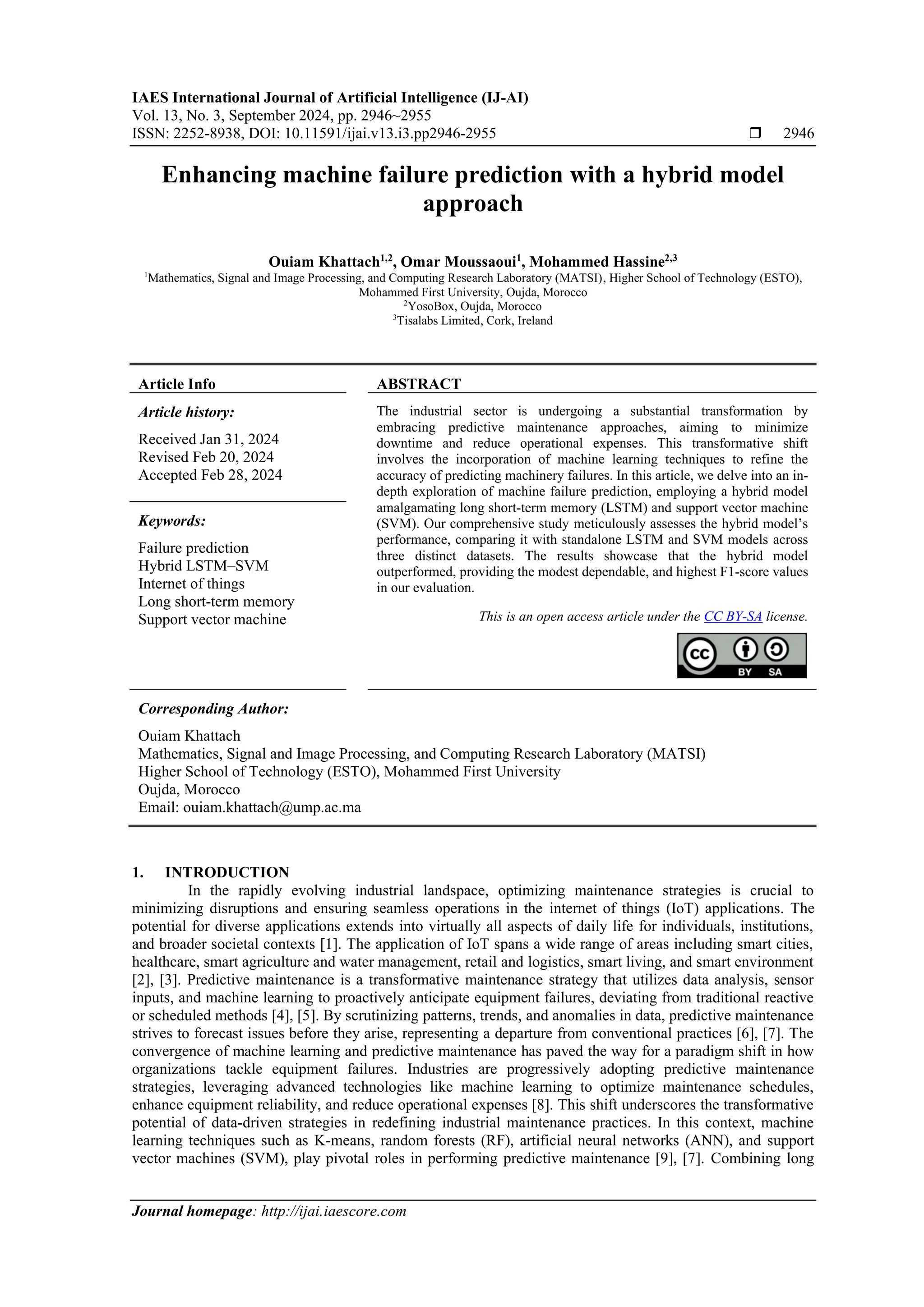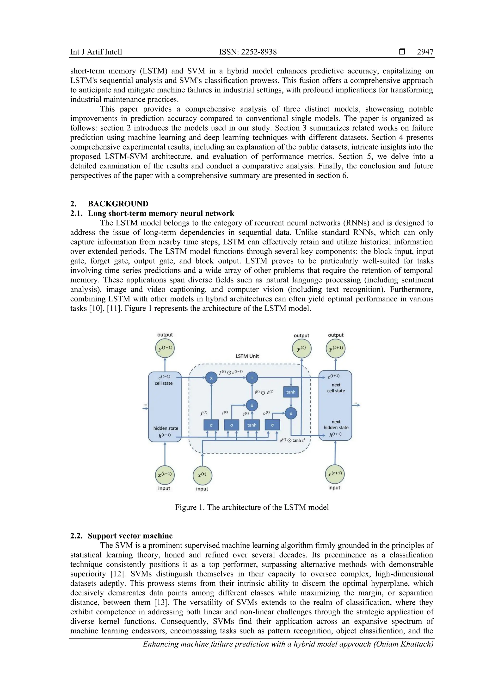 The industrial sector is undergoing a substantial transformation by embracing predictive maintenance approaches, aiming to minimize downtime and reduce operational expenses. This transformative shift involves the incorporation of machine learning techniques to refine the accuracy of predicting machinery failures. In this article, we delve into an in-depth exploration of machine failure prediction, employing a hybrid model amalgamating long short-term memory (LSTM) and support vector machine (SVM). Our comprehensive study meticulously assesses the hybrid model’s performance, comparing it with standalone LSTM and SVM models across three distinct datasets. The results showcase that the hybrid model outperformed, providing the modest dependable, and highest F1-score values in our evaluation.