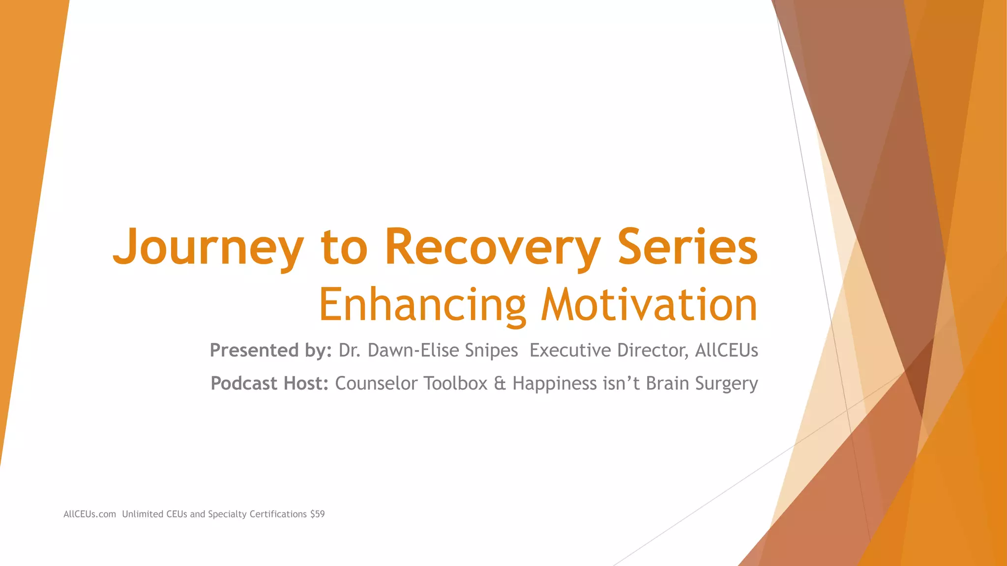 This document discusses enhancing motivation for recovery. It defines motivation and explores its multidimensional nature. Motivation involves recognizing the need for change, identifying benefits, addressing drawbacks, and creating and implementing a plan. Types of motivation include mental, emotional, environmental, physical, social, and occupational factors. The stages of change model outlines precontemplation, contemplation, preparation, action, and maintenance. Developing and maintaining motivation requires understanding an individual's specific situation and balancing the factors influencing their motivation.