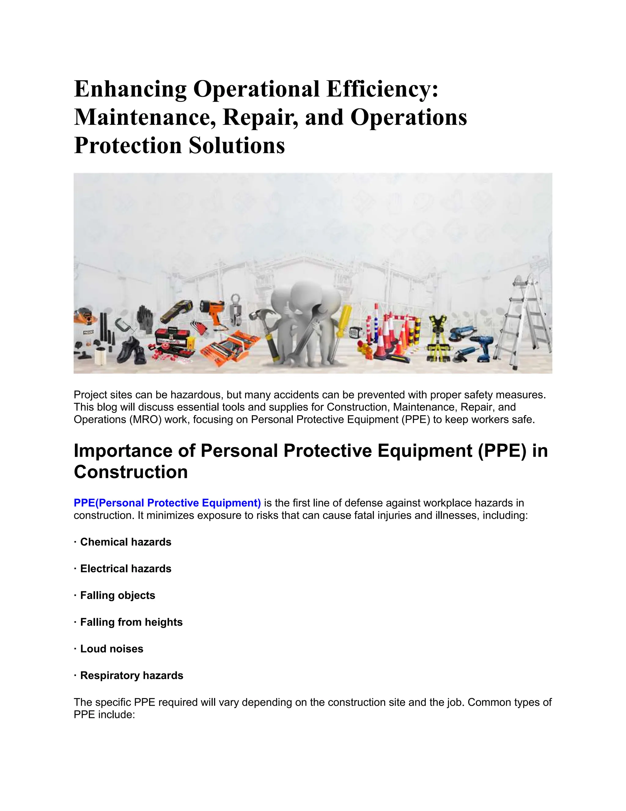 The document discusses the importance of personal protective equipment (PPE) in preventing workplace hazards in construction and maintenance operations. It outlines various types of PPE and additional safety solutions that can enhance operational efficiency and worker safety on project sites. By prioritizing proper safety measures and tools, construction companies can create a safer work environment.