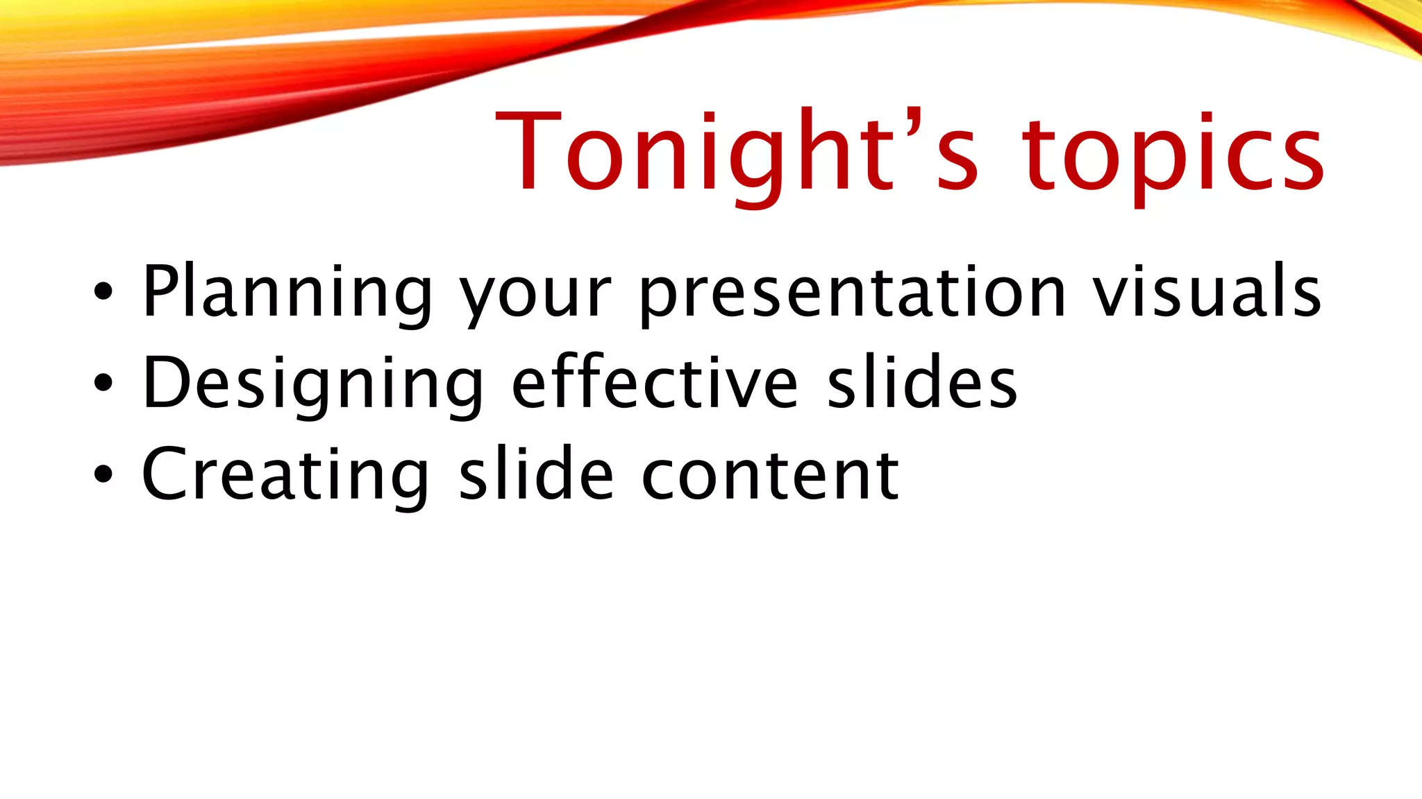 This document provides guidance on enhancing presentations with effective visuals such as slides. It discusses planning presentations by considering the visuals and content, designing visually appealing slides through appropriate use of color, artwork, and typefaces, and ensuring slide content is concise by keeping text brief and focusing on the key message to avoid overloading the audience. The document also mentions some rules for an activity involving dividing into teams to respond to questions.