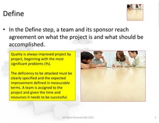 The document outlines the Lean Sigma methodology for improving service and transactional processes, detailing the steps of Define, Measure, Analyze, Improve, and Control. It emphasizes the importance of project clarity, data collection, root cause analysis, and the implementation of improvements that enhance service efficiency and quality. Key tools and metrics for each phase are provided to guide teams in effectively addressing process deficiencies and sustaining gains.