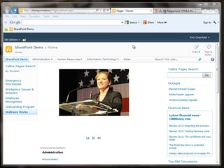 The document discusses the integration of responsive web design (RWD) with SharePoint to enhance usability across various devices. It highlights the importance of adopting RWD due to the increasing prevalence of mobile devices and provides a step-by-step guide for implementing responsive design in SharePoint 2010 and 2013. Additionally, it offers resources for further learning and emphasizes building future-ready designs.