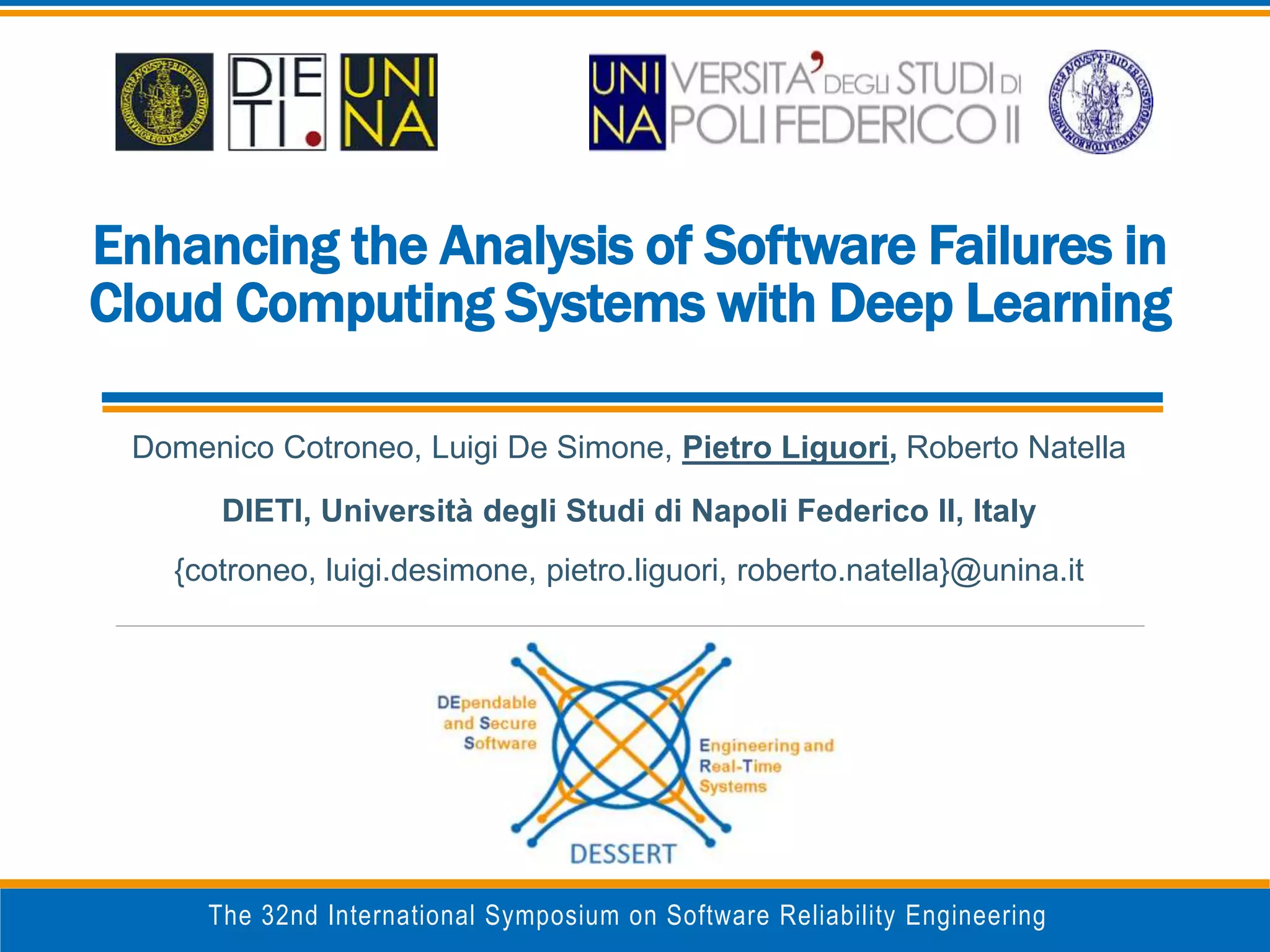 The document discusses a novel approach to analyze software failures in cloud computing systems using deep learning and fault injection, specifically focusing on OpenStack. It presents findings from 2,538 fault-injection experiments and compares the effectiveness of deep embedded clustering (DEC) with traditional clustering methods in identifying failure modes. The results indicate that DEC can achieve comparable or superior performance to manual tuning, enhancing the interpretation of failure data for developers and system administrators.