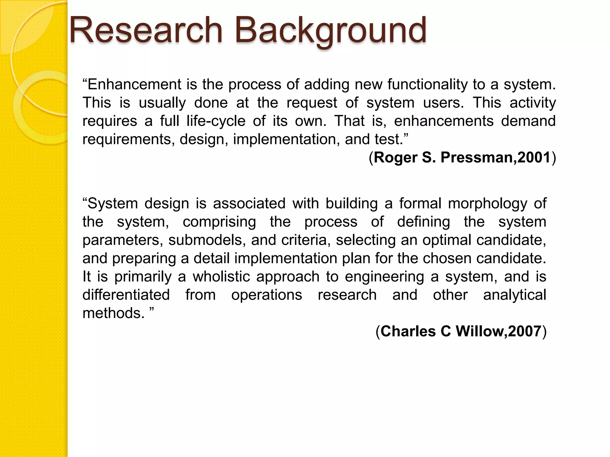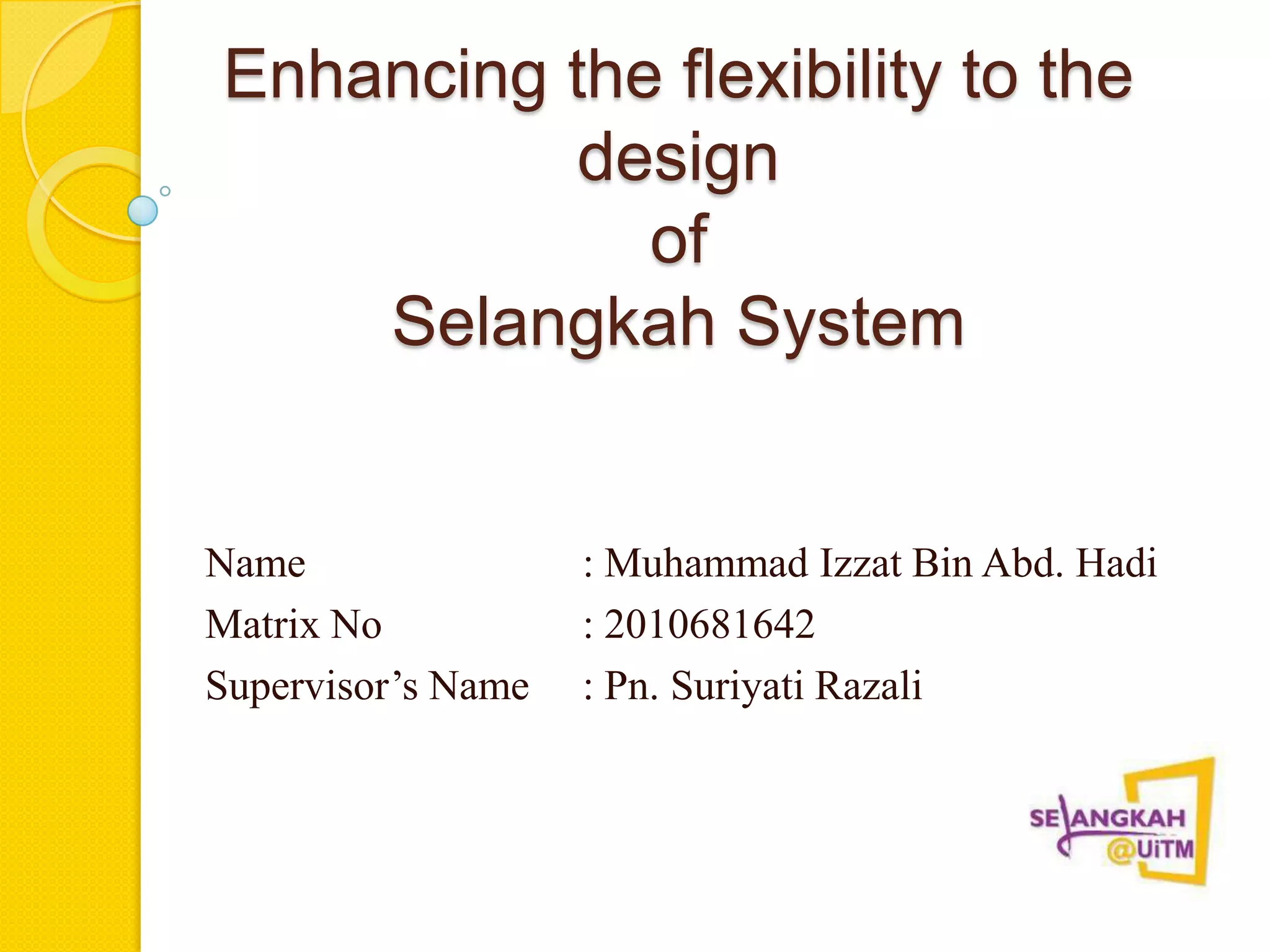 The document discusses enhancing the flexibility of the Selangkah System used by UiTM to assist students in identifying suitable study programs. It aims to allow easier changes to the system to accommodate annual updates to admission rules and regulations. The current system's hardcoded rules make changes difficult. The research will review the system, verify requirements, and design a more flexible system through documentation and a design that allows dynamic rule changes. This will benefit both students and administrators.
