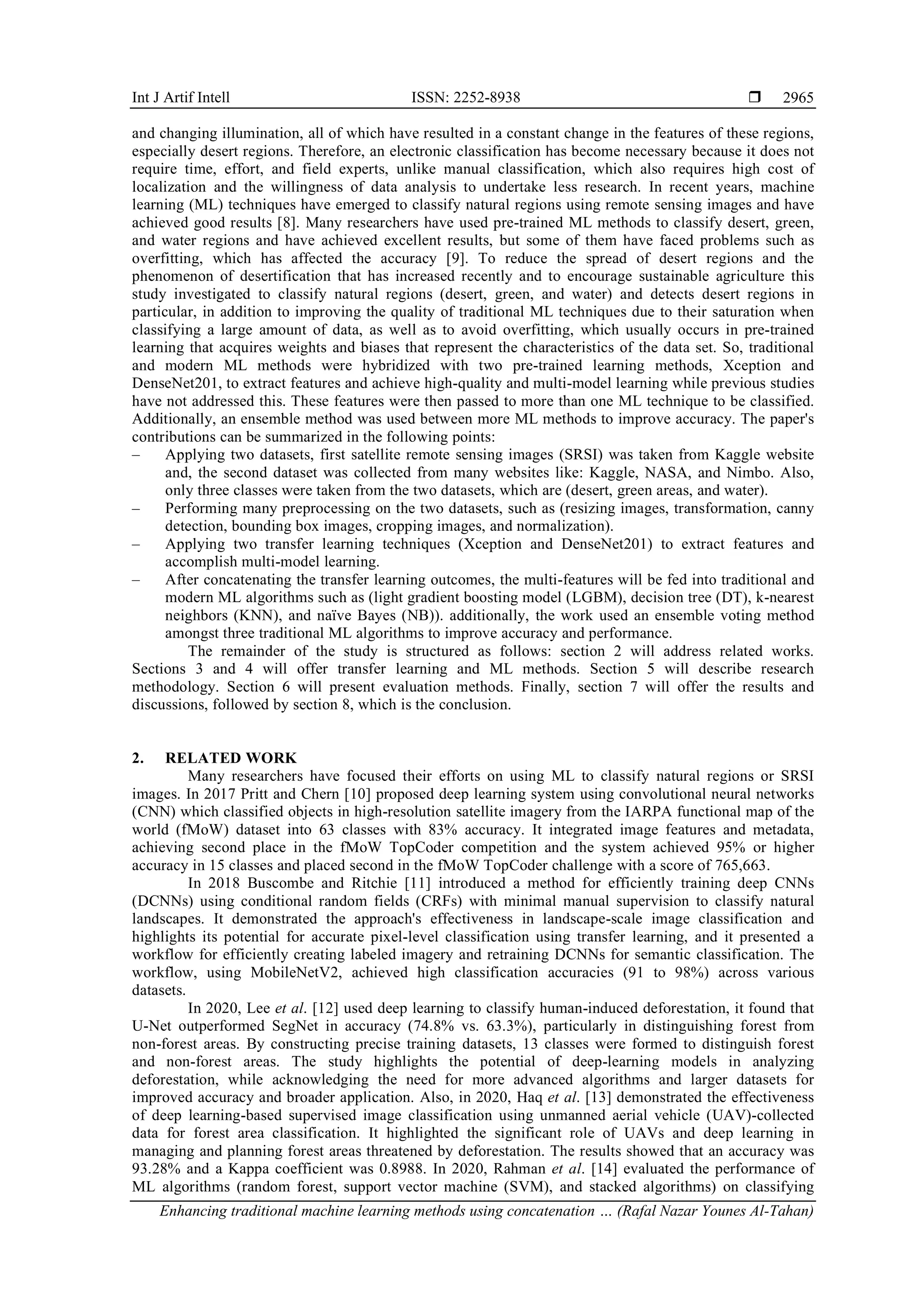 Deserts cover a significant portion of the earth and present environmental and economic difficulties owing to their harsh conditions. Satellite remote sensing images (SRSI) have evolved into an important tool for monitoring and studying these regions as technology has advanced. Machine learning (ML) is critical in evaluating these images and extracting valuable information from them, resulting in a better knowledge of hard settings and increasing efforts toward sustainable development in desert regions. As a result, in this study, four ML approaches were enhanced by hybridizing them with pre-training methods to achieve multi model learning. Two pre-training approaches (Xception and DeneseNet201) were used to extract features, which were concatenated and fed into ML algorithms: light gradient boosting model (LGBM), decision tree (DT), k-nearest neighbors (KNN), and naïve Bayes (NB). In addition, an ensemble voting was used to improve the outcomes of ML algorithms (DT, NB, and KNN) and overcome their flaws. The models were tested on two datasets and hybrid LGBM outperformed other traditional ML methods by 99% in accuracy, precision, recall, and F1 score, and by 100% in area under the curve (AUC)-receiver operating characteristic (ROC).