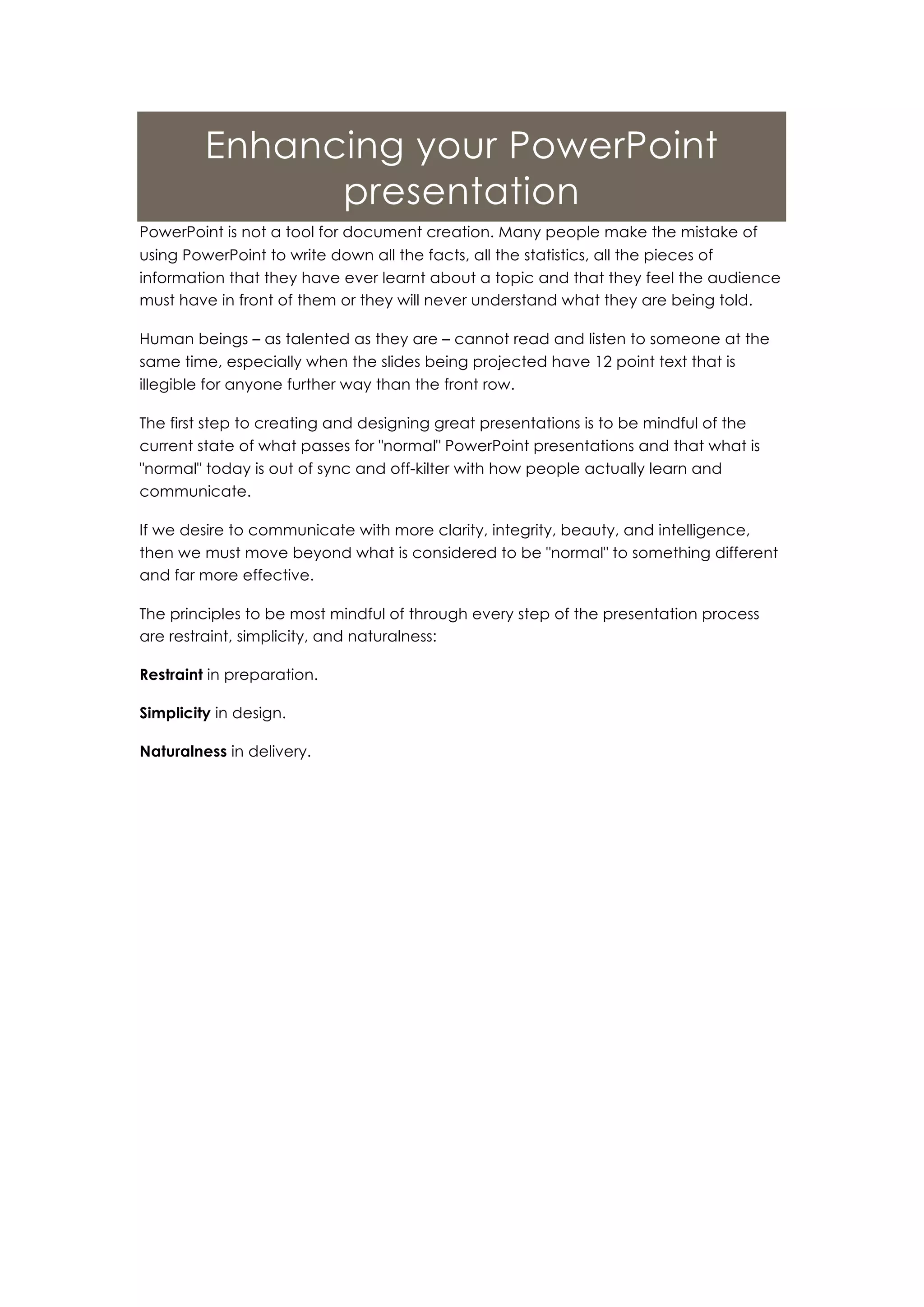 A good presentation has interesting, audience-focused content organized simply with few bullet points. Visuals should be relevant to the content and animations should enhance the message. An effective presentation involves practicing to deliver the content clearly and engagingly with humor when appropriate. Key principles for design include contrast, repetition, alignment, and proximity to create a cohesive visual experience for the audience.