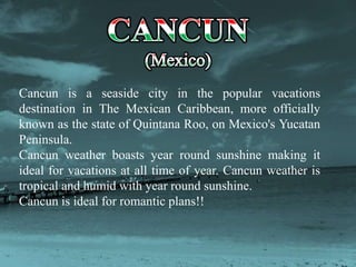 Cancun is a popular tourist destination located on Mexico's Yucatan Peninsula known for its year-round sunshine and tropical weather. The document provides tips for planning a trip to Cancun including what to pack and highlights several outdoor and cultural activities to enjoy like scuba diving, visiting Mayan ruins, and exploring ecological parks featuring the local flora and fauna. Popular day trips from Cancun include Isla Mujeres, Puerto Morelos, and Xcaret Park.