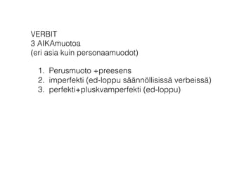PLUSKVAMPERFEKTI= minä OLINollut, kesä OLI ollut, Taavi OLI pelannut jne
