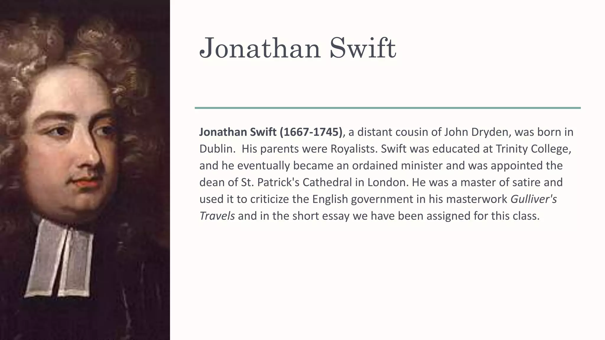 This document provides summaries of readings for the week including short biographies of Jonathan Swift, Wilfred Owen, Katherine Mansfield, Jean Rhys, and Nadine Gordimer. It also summarizes Swift's satirical essay "A Modest Proposal" and analyzes some of his other works. For the poets Owen and Wilfred, it highlights some of their notable poems and discusses literary elements. Similarly, it introduces Mansfield, Rhys, and Gordimer's short stories and notes themes and social contexts.