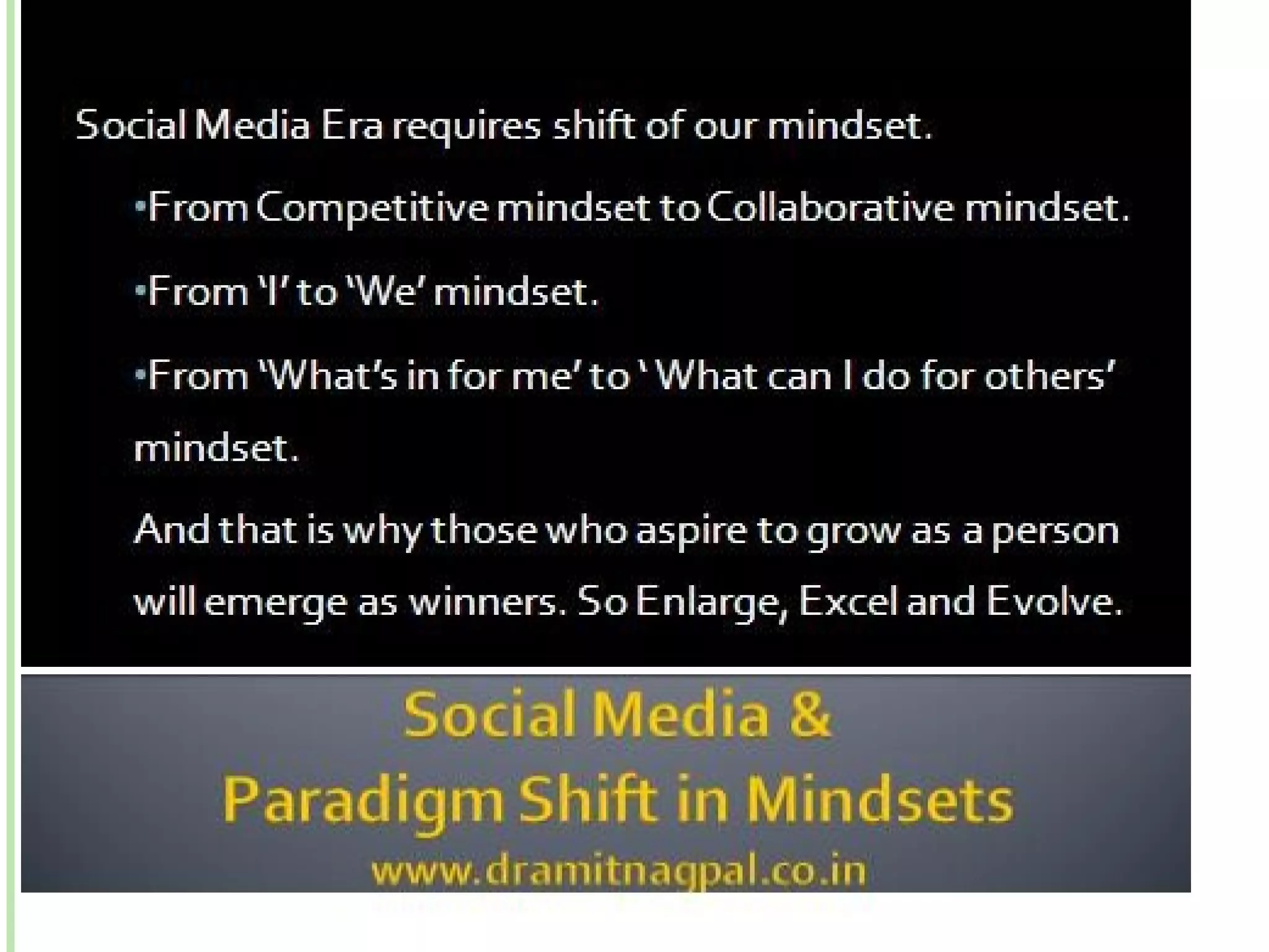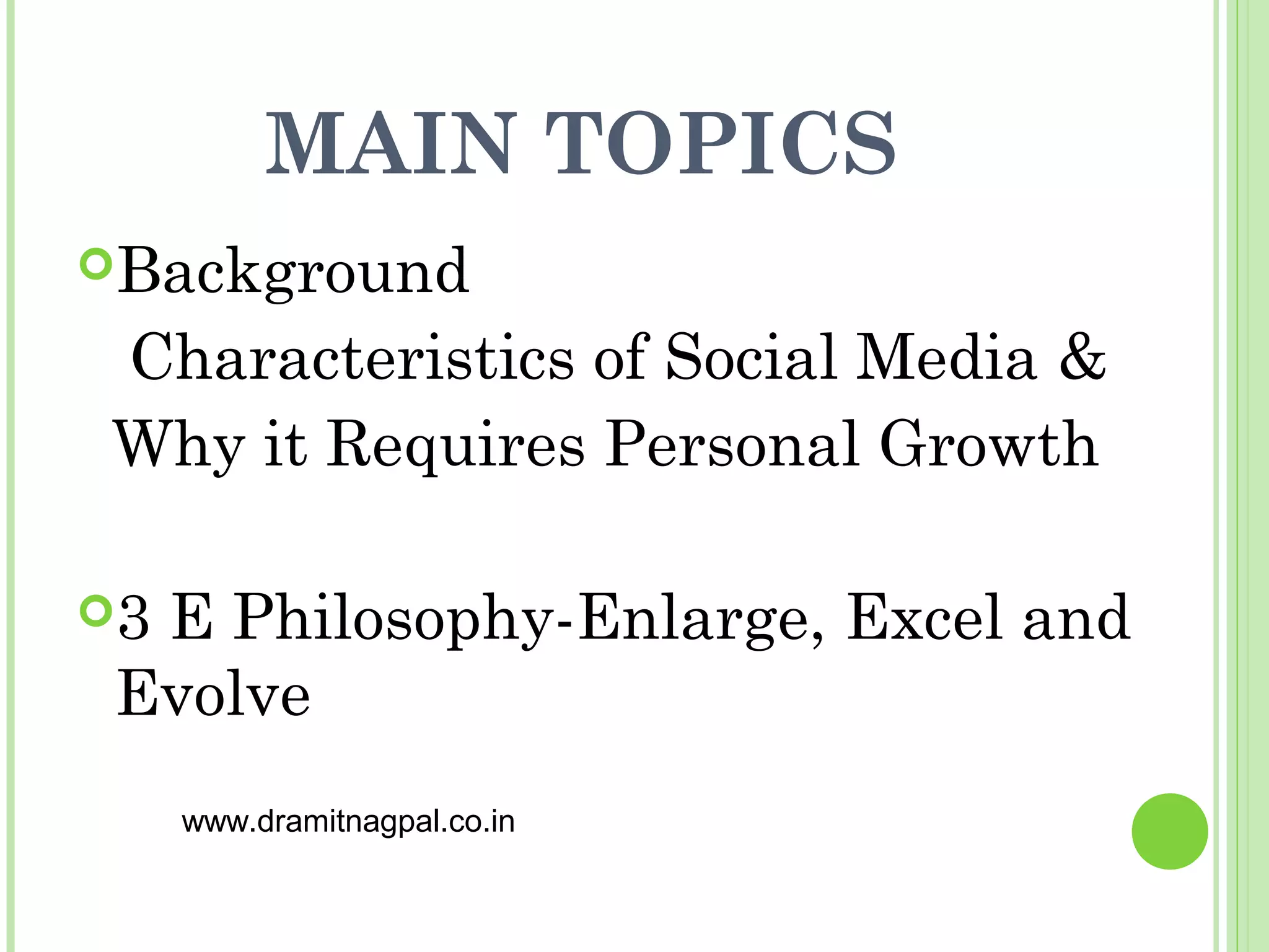 The document discusses a 3E philosophy of personal growth and development for social media success. The 3Es are:
