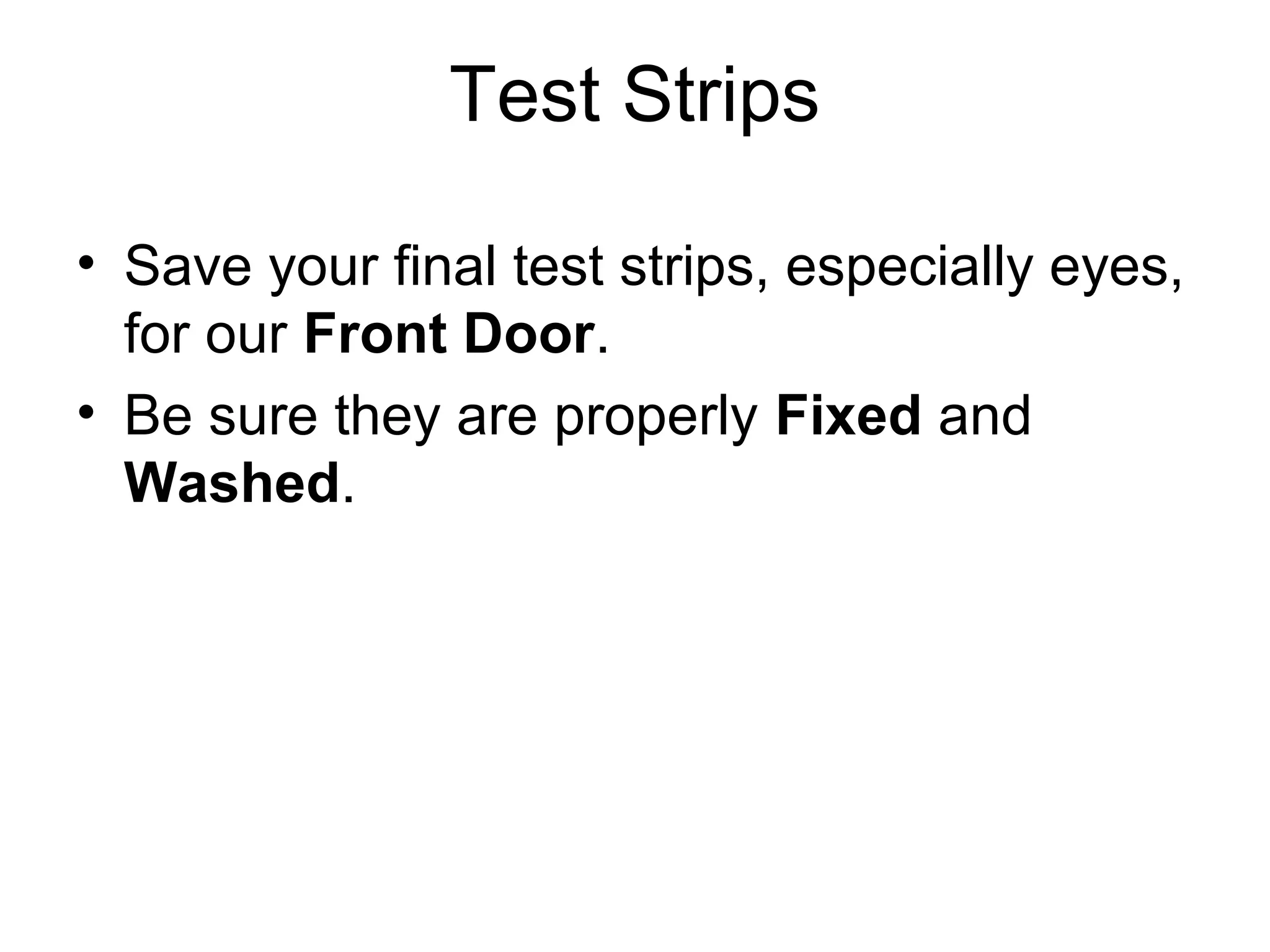 Rinse and dispose of test strips as you go…do not let them pile up in the developer, stop,