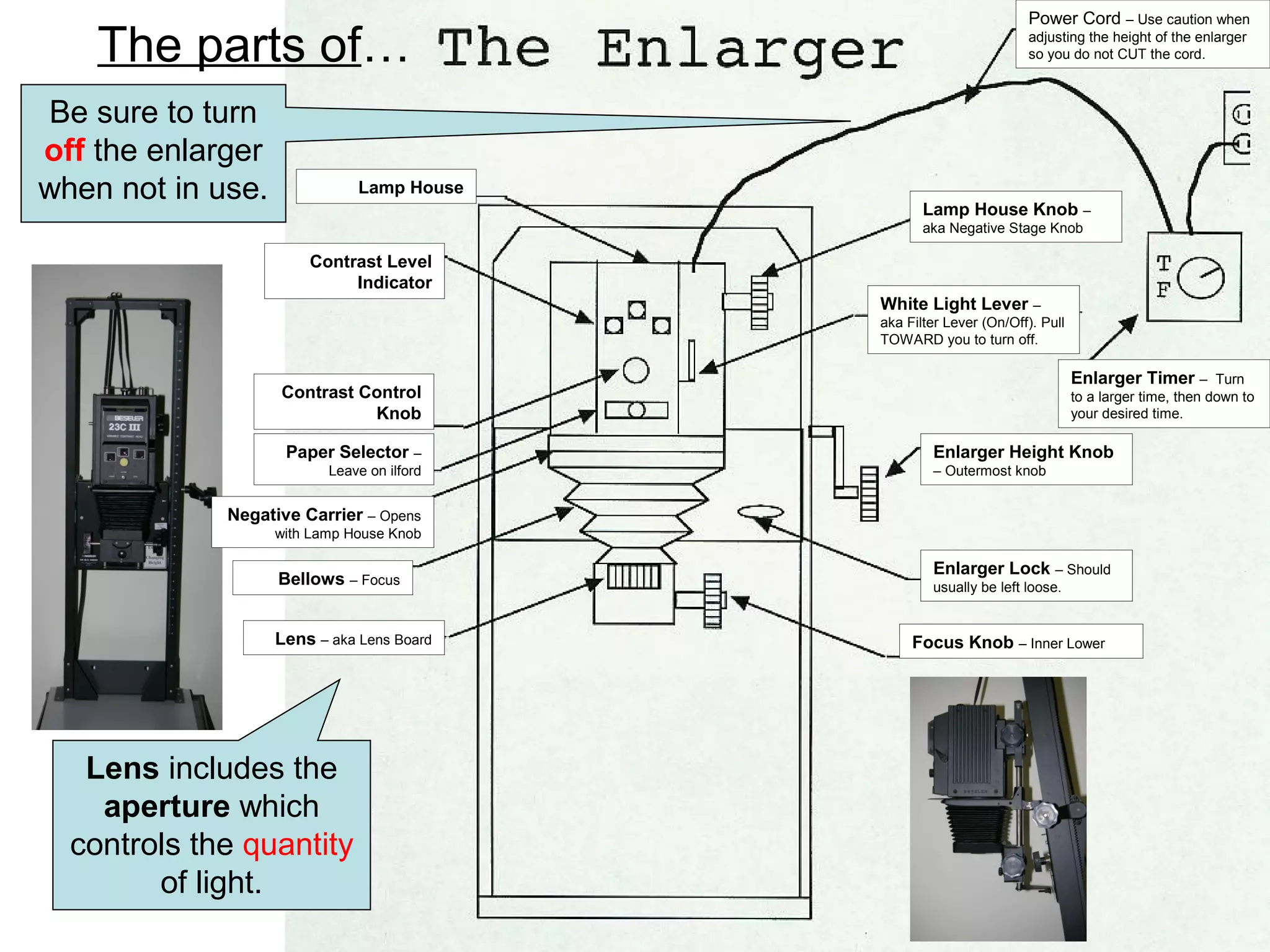 Learn the “CLICKS” of the f/stops on the enlarger lens…the numbers are identical to the camera after