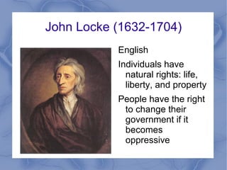 John Locke believed that individuals have natural rights to life, liberty, and property, and the right to change an oppressive government. Montesquieu proposed that the best form of government divides power into judicial, legislative, and executive branches to check political power. Voltaire advocated for freedom of thought, speech, and religion as well as separation of church and state. Rousseau and Wollstonecraft argued that government should be based on popular sovereignty and secure equal rights and justice for all, including extending rights to women through education and suffrage.