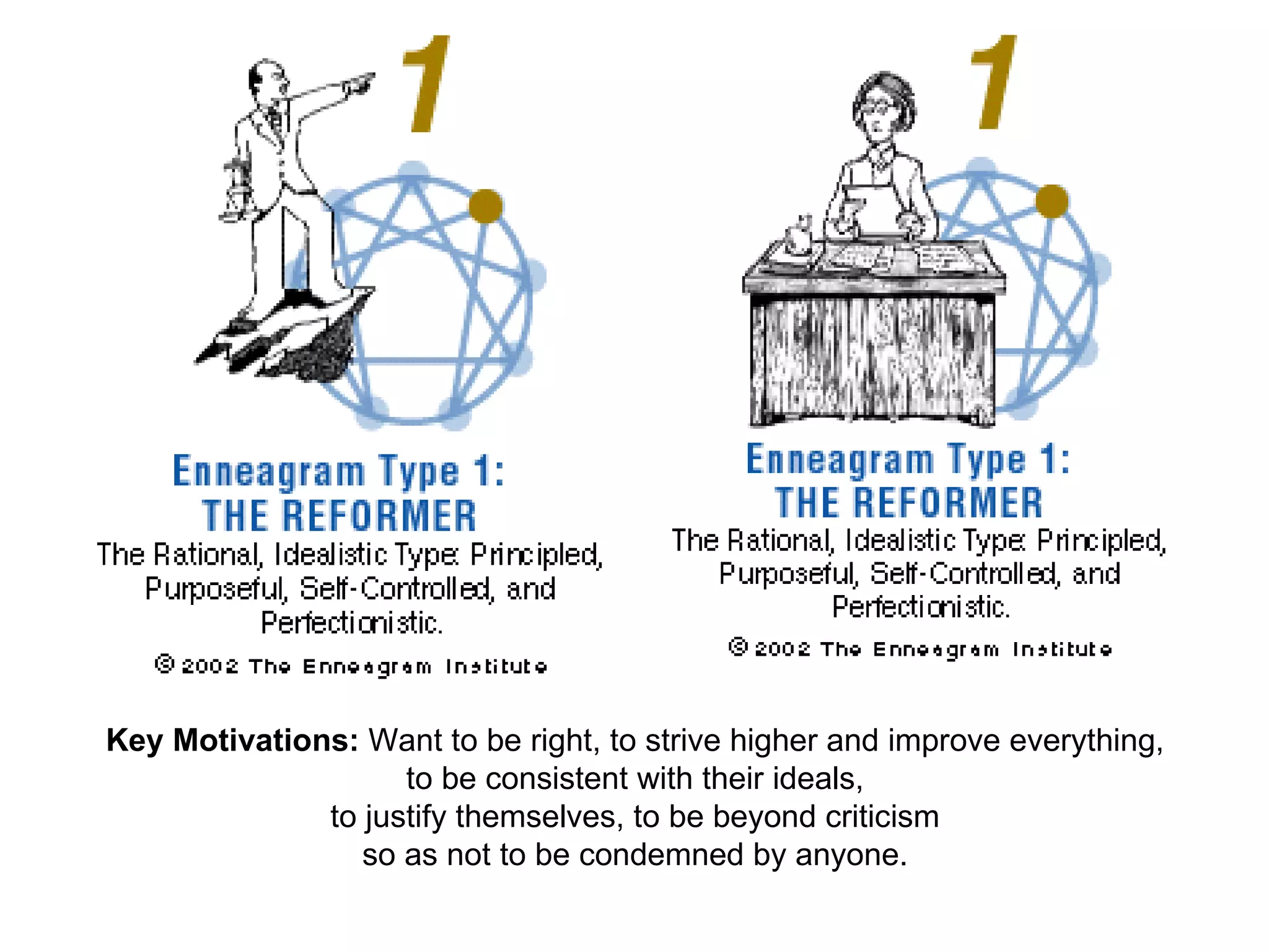 The document describes the nine Enneagram personality types, including their key motivations, basic fears, and basic desires. Each type is also described with wings that modify their personality type slightly. The nine types are Ones, Twos, Threes, Fours, Fives, Sixes, Sevens, Eights, and Nines.